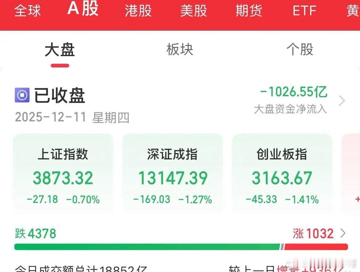 1.88万亿,内资疯狂卖出1012亿,指数尾盘全线下挫,创业板从涨幅超1%到跌幅超1%,北证逆势上涨3.84%早盘强势,午后指数快速回落,科技板块集体冲高回落,上证再度失手3900点,创业板跌幅1.41%,科技不了合力,就得下去再呆呆,毕竟12月以来市场是乱炖一锅粥的,差点都要糊了,然后科技反弹,CPO领涨,芯片、存储出来冒了个头了,然后就没有然后了,再堆就又得挨了。