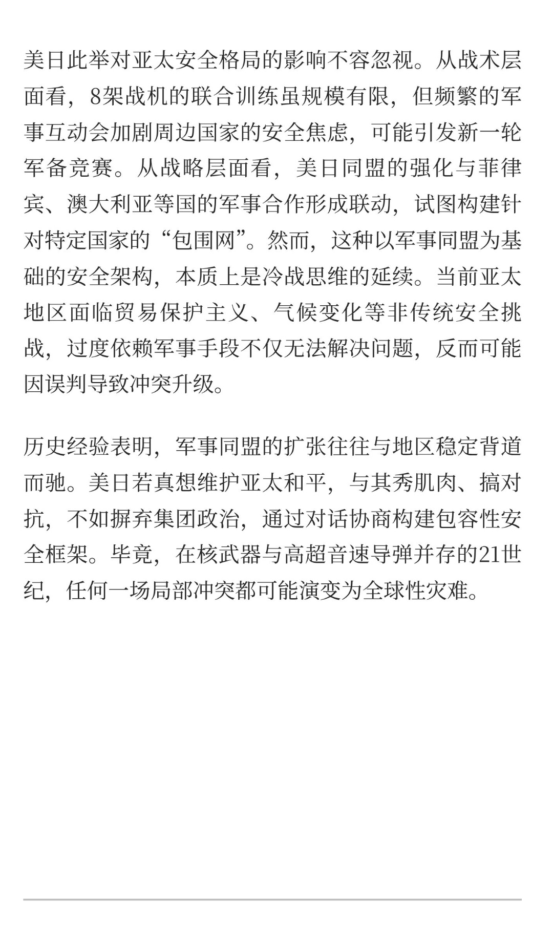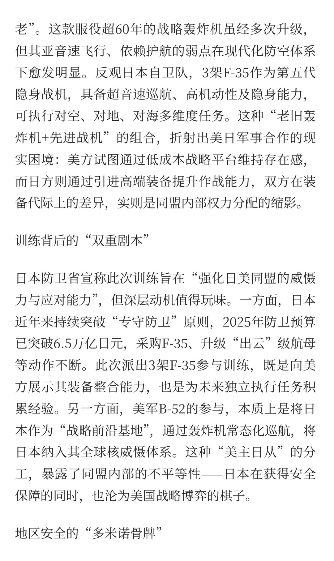 | 12月10日,日本海上空上演了一场由8架战机参与的军事行动——日本航空自卫队派出3架F-35战斗机、3架F-15战斗机,与美军2架B-52战略轰炸机展开联合训练。这场看似常规的军事互动,实则暴露出美日同盟在亚太地区的安全焦虑与战略意图。此次训练中,美军出动的B-52轰炸机堪称“冷战遗老”。这款服役超60年的战略轰炸机虽经多次升级,但其亚音速飞行、依赖护航的弱点在现代化防空体系下愈发明显。反观日本自卫队,3架F-35作为第五代隐身战机,具备超音速巡航、高机动性及隐身能力,可执行对空、对地、对海多维度任务。这种“老旧轰炸机+先进战机”的组合,折射出美日军事合作的现实困境:美方试图通过低成本战略平台维持存在感,而日方则通过引进高端装备提升作战能力,双方在装备代际上的差异,实则是同盟内部权力分配的缩影。日本防卫省宣称此次训练旨在“强化日美同盟的威慑力与应对能力”,但深层动机值得玩味。一方面,日本近年来持续突破“专守防卫”原则,2025年防卫预算已突破6.5万亿日元,采购F-35、升级“出云”级航母等动作不断。此次派出3架F-35参与训练,既是向美方展示其装备整合能力,也是为未来独立执行任务积累经验。另一方面,美军B-52的参与,本质上是将日本作为“战略前沿基地”,通过轰炸机常态化巡航,将日本纳入其全球核威慑体系。这种“美主日从”的分工,暴露了同盟内部的不平等性——日本在获得安全保障的同时,也沦为美国战略博弈的棋子。美日此举对亚太安全格局的影响不容忽视。从战术层面看,8架战机的联合训练虽规模有限,但频繁的军事互动会加剧周边国家的安全焦虑,可能引发新一轮军备竞赛。从战略层面看,美日同盟的强化与菲律宾、澳大利亚等国的军事合作形成联动,试图构建针对特定国家的“包围网”。然而,这种以军事同盟为基础的安全架构,本质上是冷战思维的延续。当前亚太地区面临贸易保护主义、气候变化等非传统安全挑战,过度依赖军事手段不仅无法解决问题,反而可能因误判导致冲突升级。历史经验表明,军事同盟的扩张往往与地区稳定背道而驰。美日若真想维护亚太和平,与其秀肌肉、搞对抗,不如摒弃集团政治,通过对话协商构建包容性安全框架。毕竟,在核武器与高超音速导弹并存的21世纪,任何一场局部冲突都可能演变为全球性灾难。