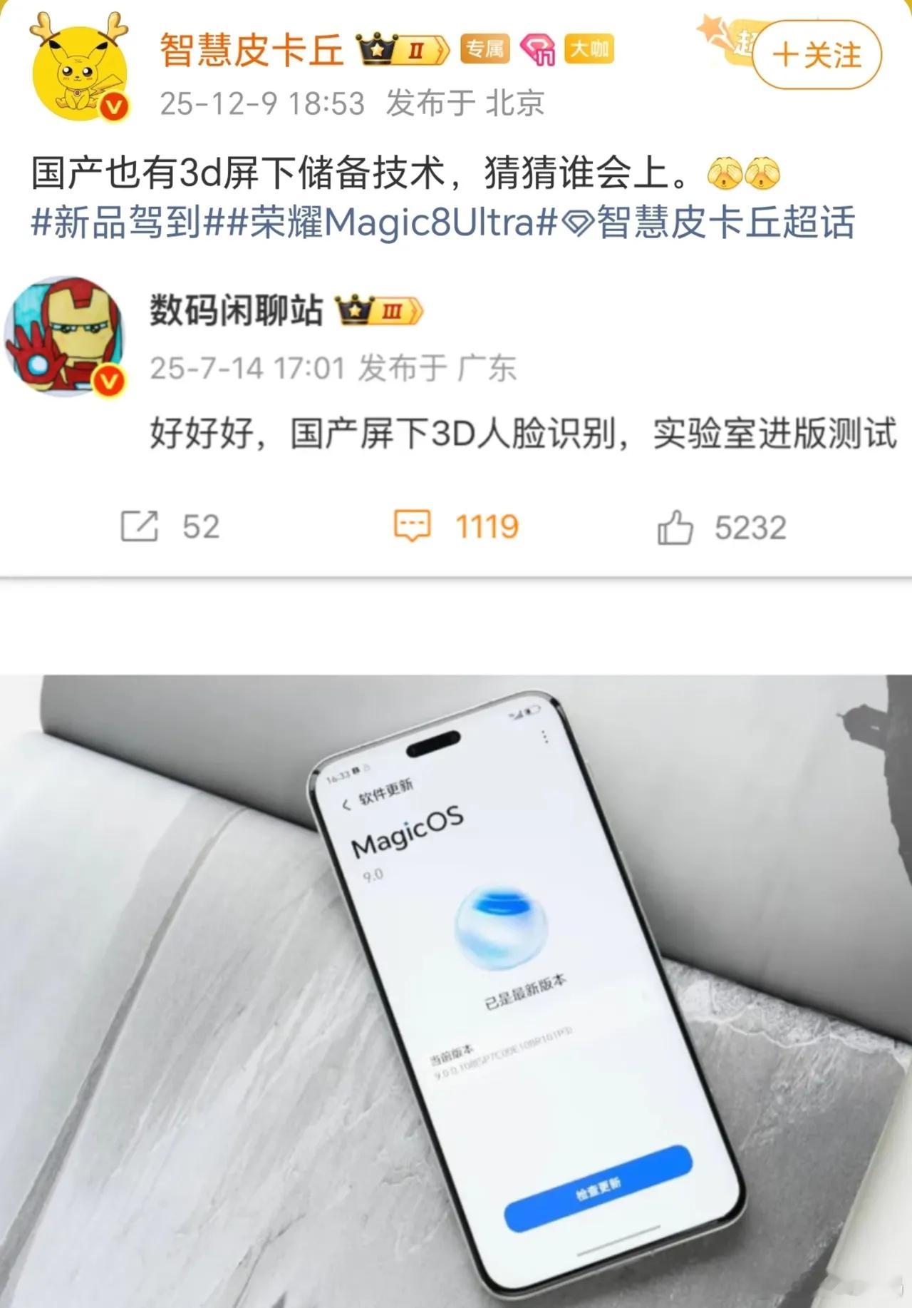 屏下镜头的这波爆料竟然不是华为也不是小米,据说是荣耀并且大概率是安卓阵营里第一个搞出屏下3D人脸识别的厂商!荣耀本来就是安卓里唯一稳做3D人脸识别的,技术储备肯定没问题。