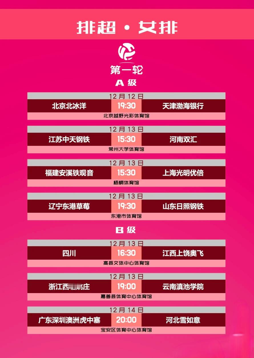 中国排球超级联赛中国排球超级联赛常规赛女排第一轮赛程 比赛时间:12月12日 女排A级 19点30 北京北冰洋 VS 天津渤海银行 15点30 江苏中天钢铁 VS 河南双汇 15点30 福建安溪铁观音 VS 上海光明优倍 19点30 辽宁东港草莓 VS 山东日照钢铁