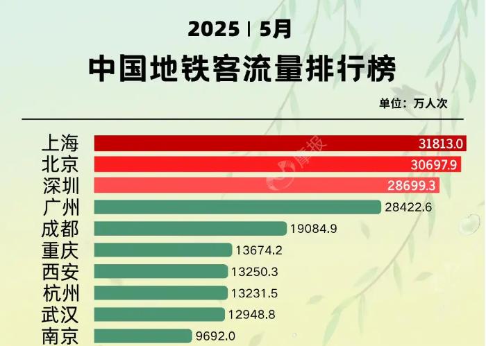 从城市地铁的客运量看城市的GDP 当大家还在为各大城市地铁客运量争论不休时,一个新的真相浮出水面,地铁客运量前十名的城市,差不多刚好是全国GDP前十强城市。 1.作为中国的四大一线城市,上海、北京、广州、深圳的地铁客流量高居前四名,属于第一梯队,2025年11月份的客运量都超过2.8亿人次。 2.成都11月份的客运量超过1.9亿人次,居第五名,杭州11月份的客运量超过1.3亿人次,居第六名。 3.西安、武汉、重庆的11月份的客运量超过1.2亿人次,它们占据第七名与第九名,南京11月份的客运量超过1亿人次,排名第十。 4.总结来说地铁客运量前十的城市只有西安的GDP不是前十名,GDP前十名的苏州地铁客运量只有0.56亿人次。苏州是下面的县级市强,市区聚集的人口、产业没那么集中。