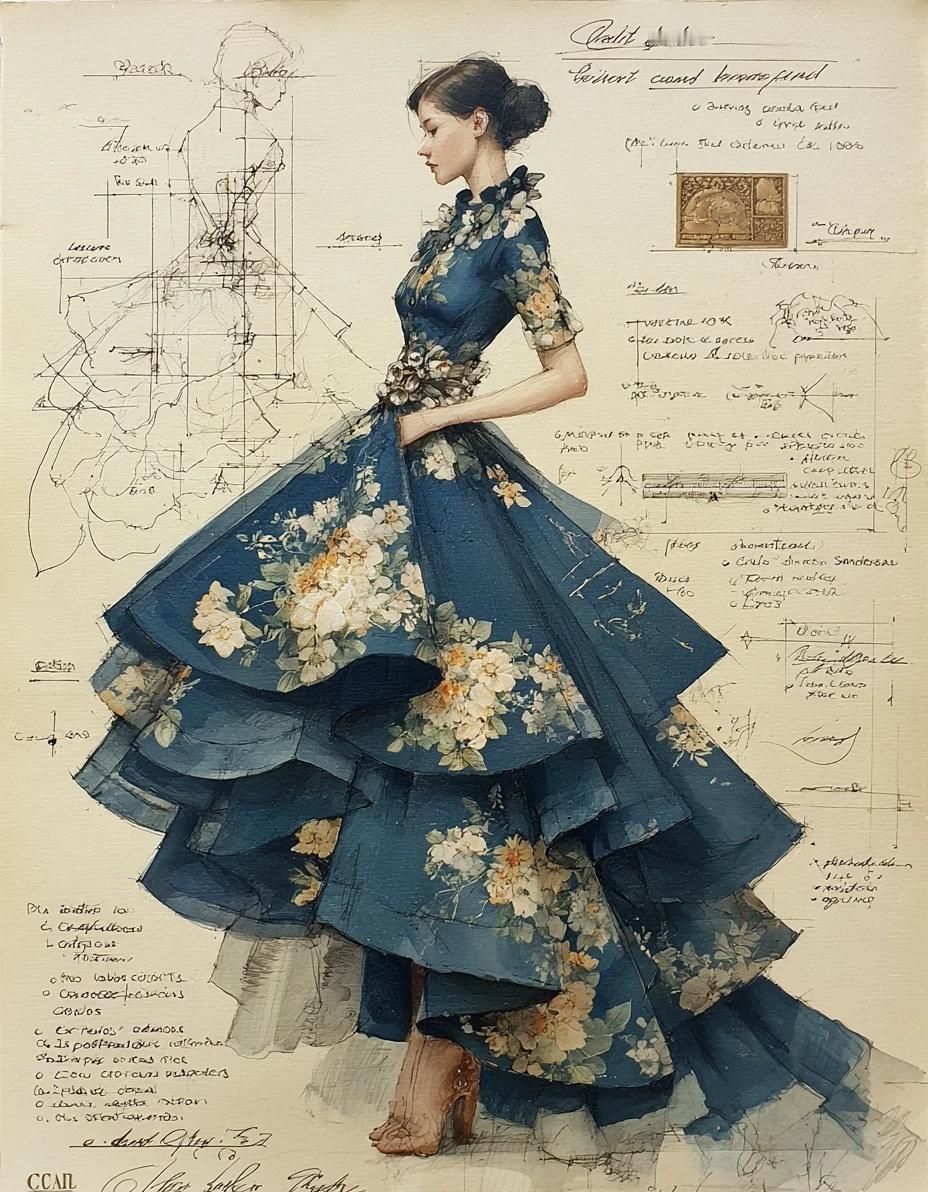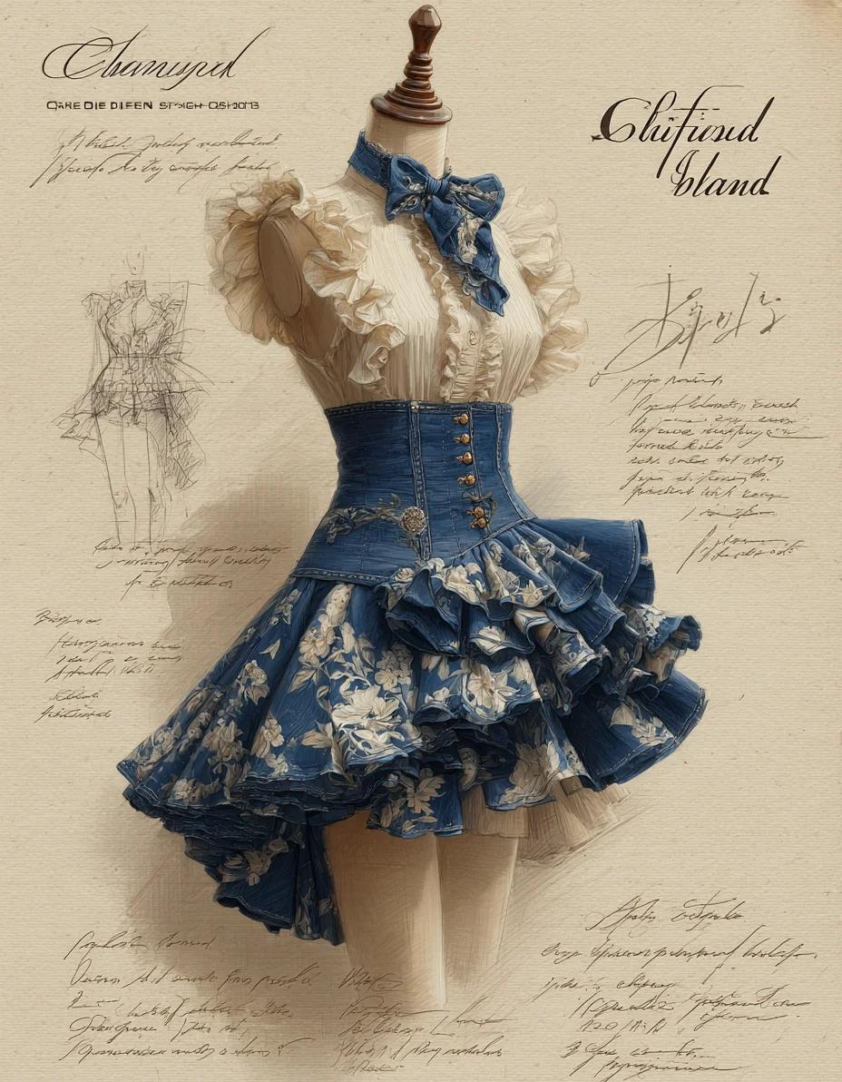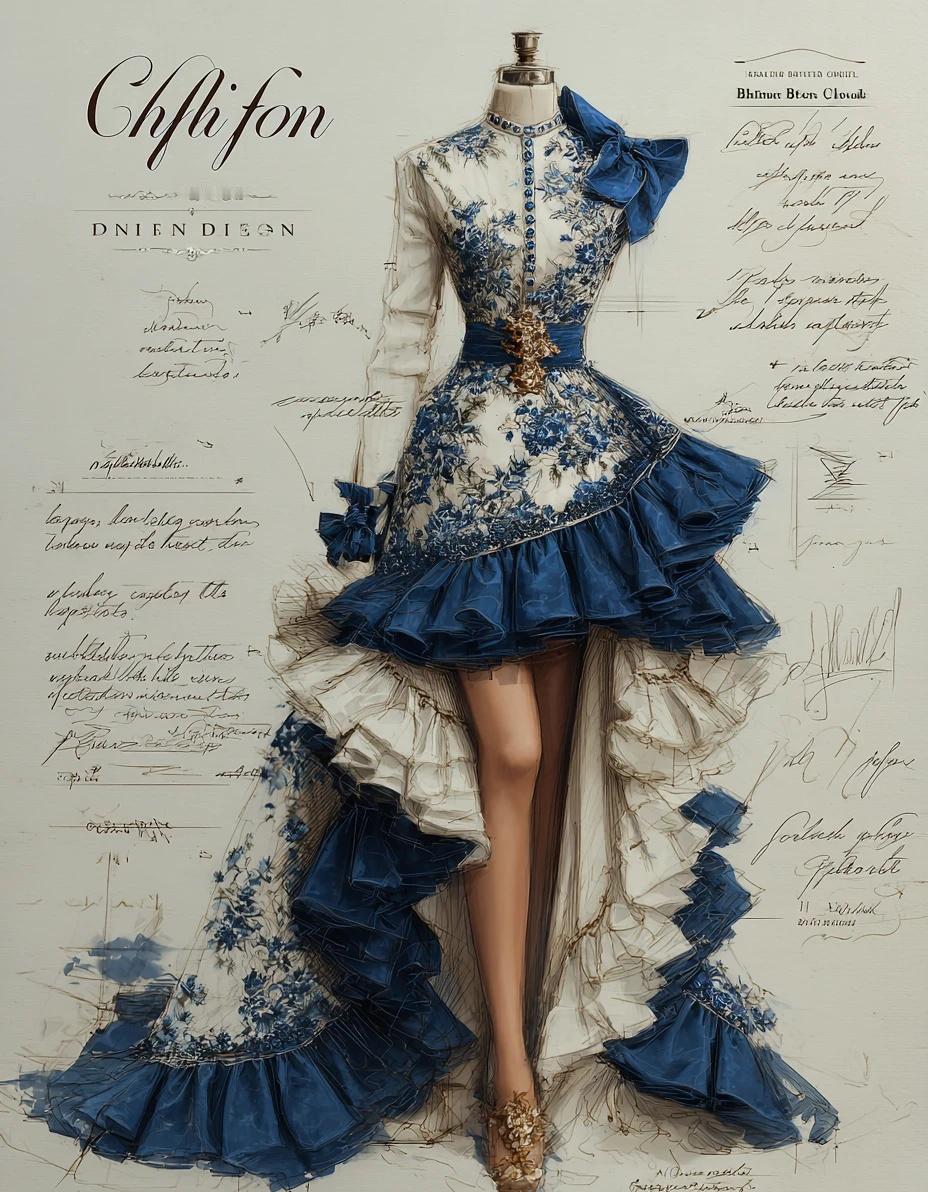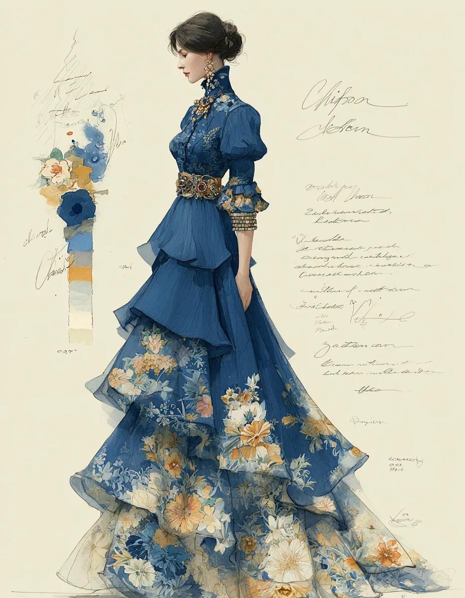AI 服设| 代尔夫特蓝瓷花 生活美学 AI绘画有点东西 时尚的轮回 花卉图案 原创服装设计 在一片神奇的蓝色花海中 时装插画 青花瓷与花的艺术碰撞 华丽与复古