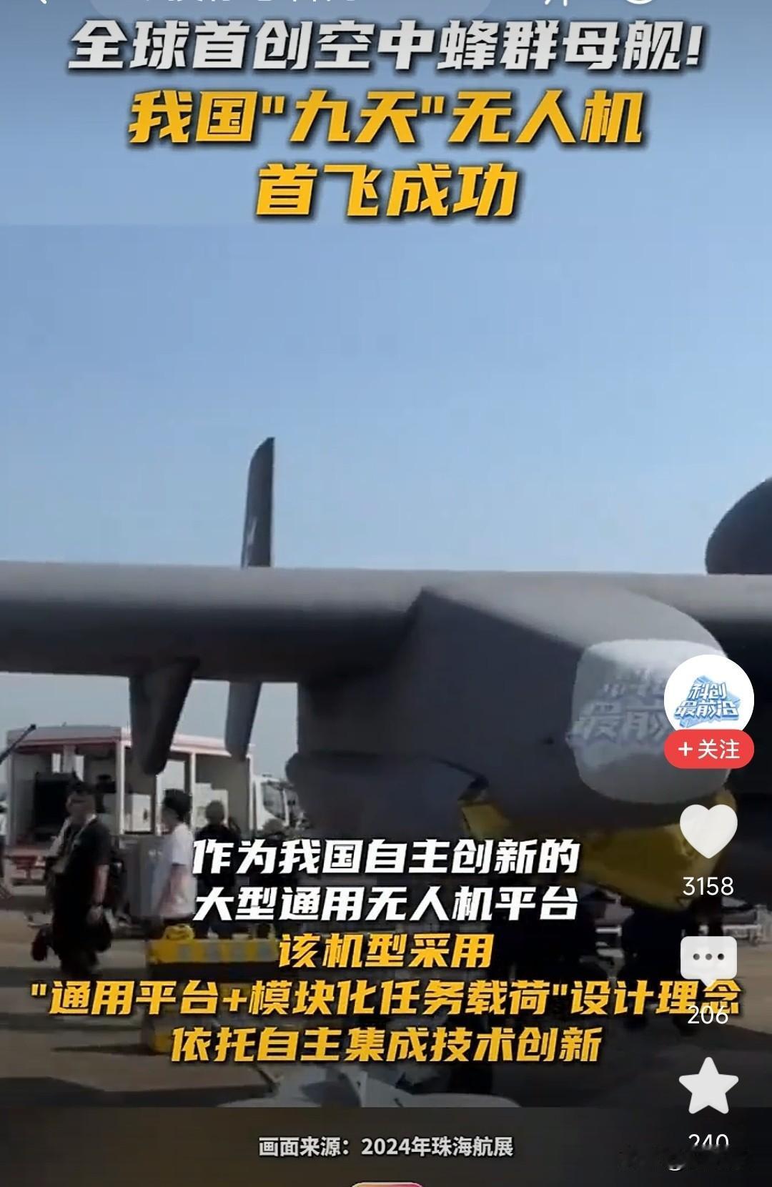 就在昨天,我国自主研发的“九天”无人机首飞成功了,全球首创空中蜂群航母。 12月