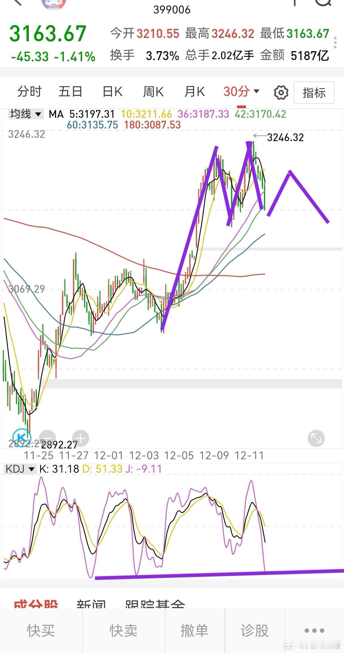 大家早!美股又历史新高了。标普涨了只有0.21%,但个股涨跌比大于7:3。今天创业板预计反弹,3166这里反弹一下,出现次级峰,再开始跌。3200以上择机看空,3228以上就是看空。这个月跟去年12月没多少区别。根据月线,创业板收盘大概率3128附近,小概率3100以下,小概率3166以上。个股依旧参考强者恒强逻辑,量化作用下,弱势股根本无法确定未来。在这种特殊阶段,弱势股反而容易亏。上证指数 继续关注消费板块。经济竞争除了科技,主要就是消费竞争。关税问题本质还是消费问题。如果我们的消费体量跟美国一样,各国都会抢着跟我们做生意。总体来说,还是强者恒强逻辑,板块逻辑现在不算突出。