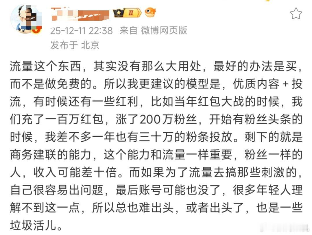 很好的回答了,为什么面对于厂长的测试,一些群体,只会扣帽子,人身攻击,甚至短信轰炸。本质上是因为已经摆脱了通过优质内容做流量的高级趣味。