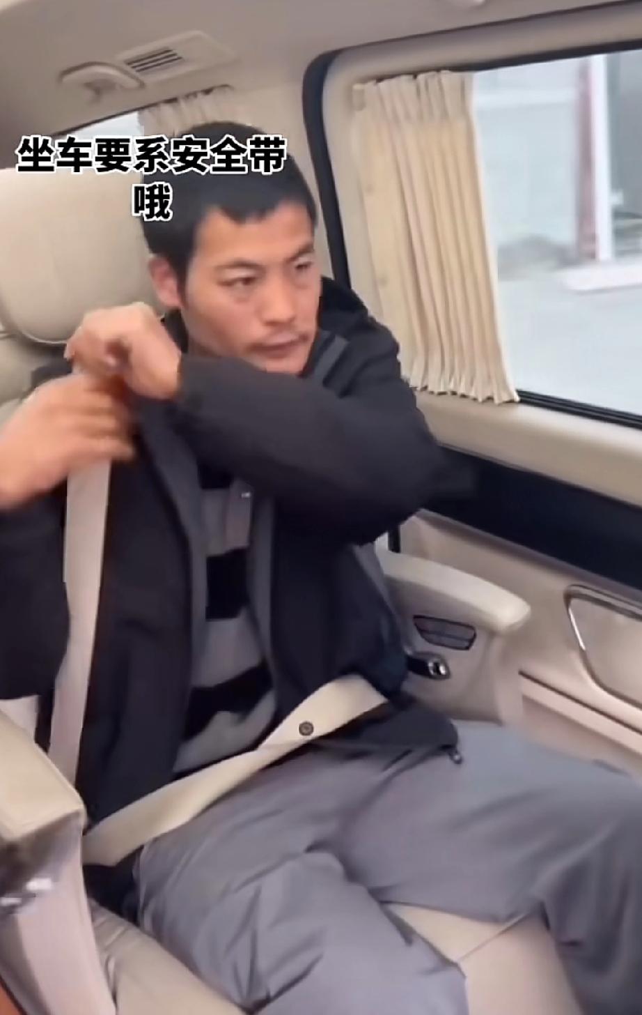 第一次坐汽车系安全带的刀疤哥着实有点笨拙可爱。把安全带套在头上找安全卡扣都找了半