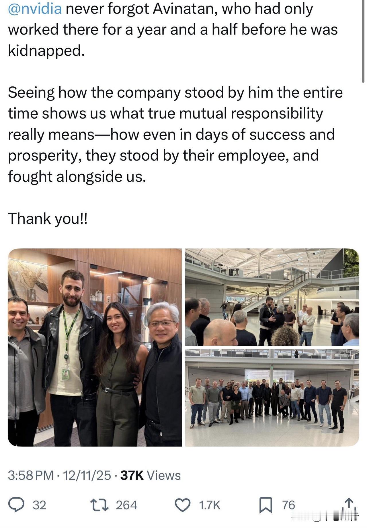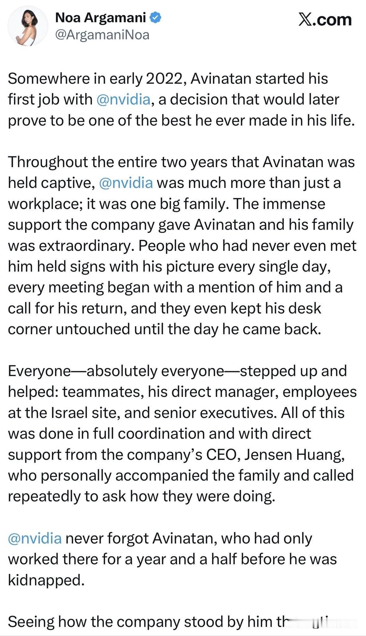 【英伟达保留空桌椅两年?除了黄仁勋,还有谁把“人”当人看】 诺娃和她男友终于去英伟达总部见了黄仁勋,这事儿最让我感慨的不是劫后余生,而是这背后的两种“温度差”。大家还记得诺娃那个武汉妈妈李春红吧?就因为她在癌症晚期求救时说了一句“难道你们不该帮我吗”,结果被简中互联网骂成了筛子,说她“变节”,说她“道德绑架”。结果呢?老太太见完女儿最后一面,是在同胞的唾沫星子里走的。 反观她女婿阿维纳坦这边,一个只入职一年半的工程师,被哈马斯绑了两年。英伟达没把他当“不良资产”剥离,反而给他留着办公桌,工资照发,全公司举牌子声援,黄仁勋亲自打电话安抚家属。这才是最讽刺的地方:我们这边天天喊着“血浓于水”,结果对一个临死的同胞百般刁难,只因为她换了本护照;而那边被我们骂作“冷血资本”的美国公司,却实实在在地把一个普通员工当成了必须要捞回来的家人。 在这个年代,别听那些宏大的口号。关键时刻,一张能让你“虽远必诛”的战狼护照,可能真不如一张英伟达的工牌管用。这就是现实,残酷得让人笑不出来。