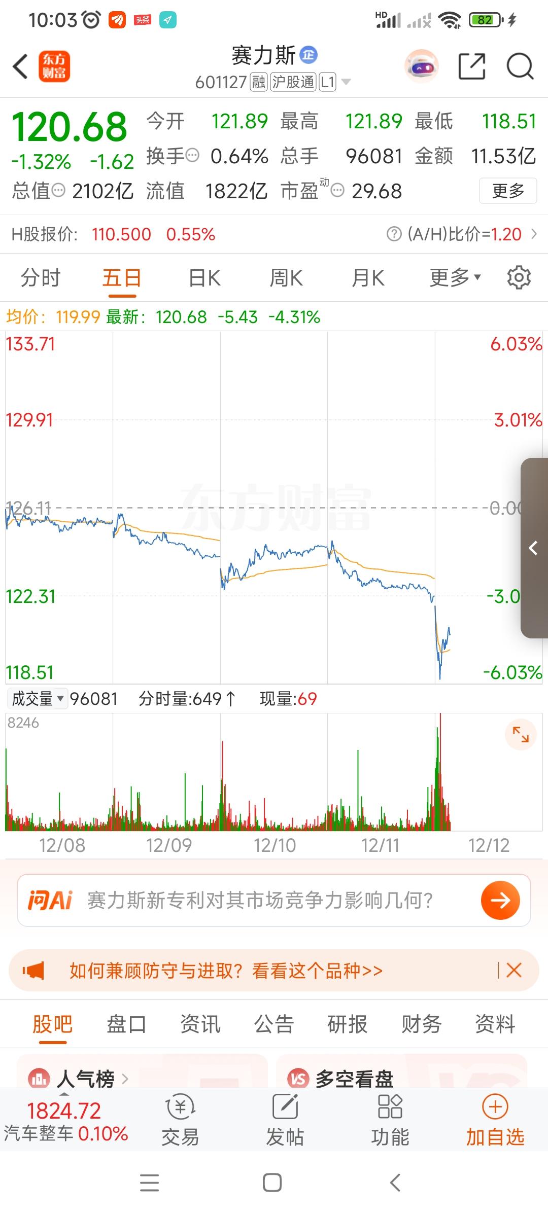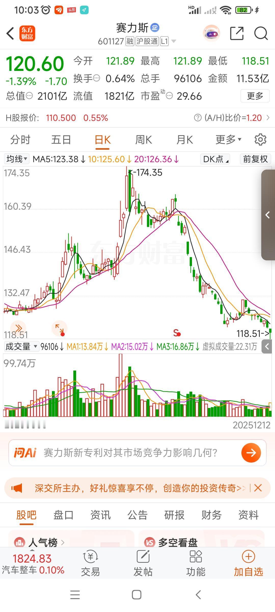 哎,真倒霉,愁死个人!我买的赛力斯股票那是一天比一天差,天天绿油油,股价一路下跌,完全看不到希望。从最高点174元跌到现在的120元,这还不到两个月的时间。现在我彻底被套牢了,资金根本抽不出来,估计过年都过不好,每天看着这情况心情都糟透了。 按理说,赛力斯属于华为品牌,华为这么伟大的企业,汽车销量又那么好,为啥这股票就是涨不起来呢?