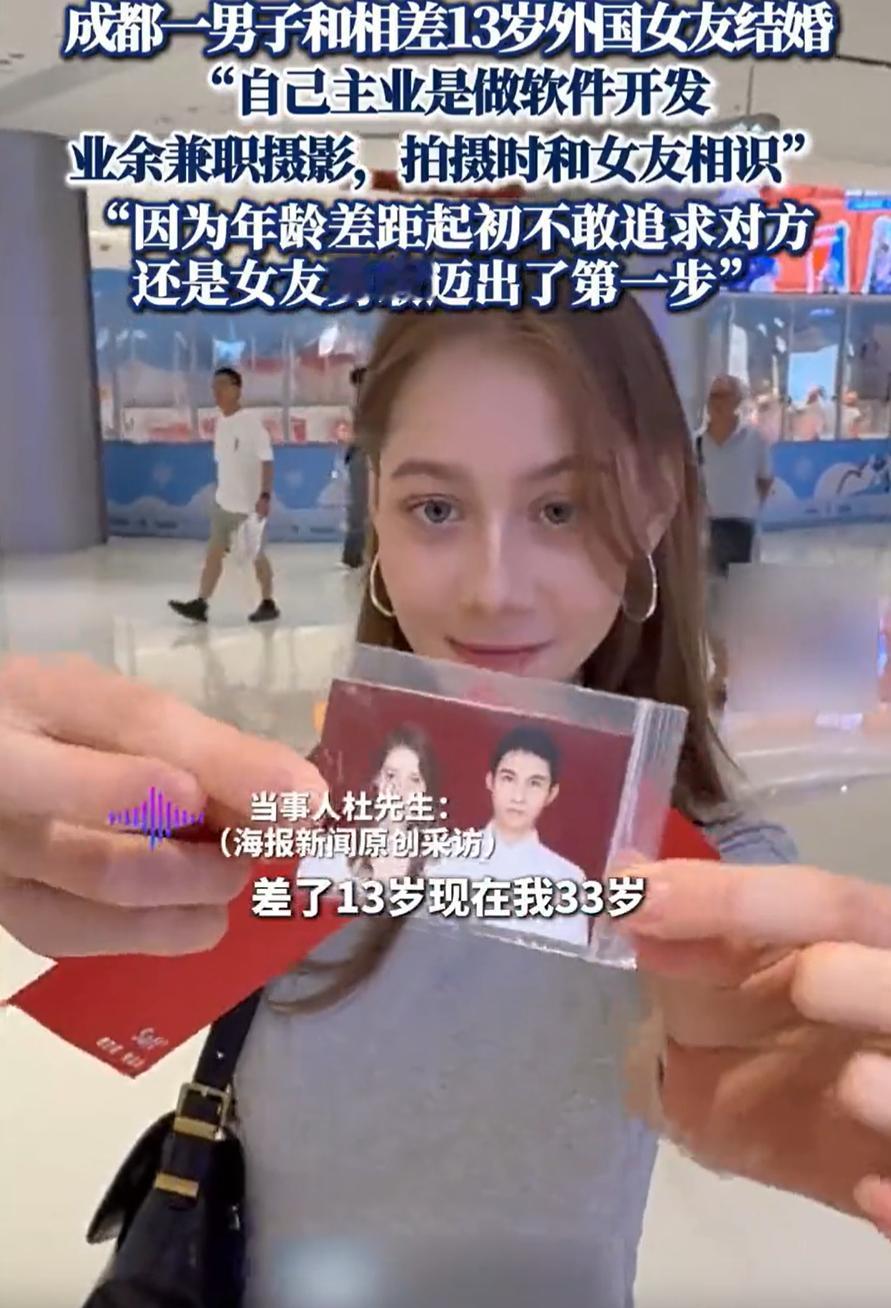 爱情不分国籍!四川成都,一名33岁男子和20岁的外籍女友结婚,让人意外的是,并非是男子主动追求,反而是女友迈出第一步,不顾家人反对嫁了过来,网友:我现在学拍摄还来得及吗? 杜先生介绍,自己今年33岁,主业是做软件开发的,但也会兼职摄影工作,妻子比自己小13岁,刚刚20岁,是来做模特的,两个人最初也是因为工作碰到一起,一个镜头前,一个镜头后,原本都是各忙各的,时间久了发现节奏对得上,聊天也顺,感情就是这么自然而然地起了头 听说女儿要嫁过来结婚,妻子的父母第一反应是反对的,毕竟嫁到这么远的地方,父母有担心是正常的,可即便如此,他们还是更尊重女儿的意愿,就这样,两人完成了跨国婚姻 当然,玩笑归玩笑,其实大家心里明白,哪是因为摄影,不过是因为这两个人恰好遇到了,一个敢说,一个敢接,彼此都没因为国籍、年龄或者距离而退缩 年龄差13岁,双方背景不同,生活饮食习惯有差异,这些在旁观者眼里可能是巨大的鸿沟,但在当事人那里,可能就是日常需要磨合的一件件小事。今天学着做对方家乡的菜,明天解释一个笑话,后天商量过年去谁家。日子不是靠激情撑下去的,是靠这些具体而微的努力 很多人觉得跨国恋浪漫,其实浪漫底下全是实在的功夫。语言得通吧,至少有一方得努力学;经济基础得有吧,签证、生活、未来安排,样样不容易;两边家庭的关系得维系吧,隔着时差和距离,这份用心更得加倍 所以,别光羡慕人家娶了外国媳妇。该看到的,是这两个人,尤其是那个20岁姑娘的勇气——她在异国他乡工作,主动选择了爱的人,还说服了家人