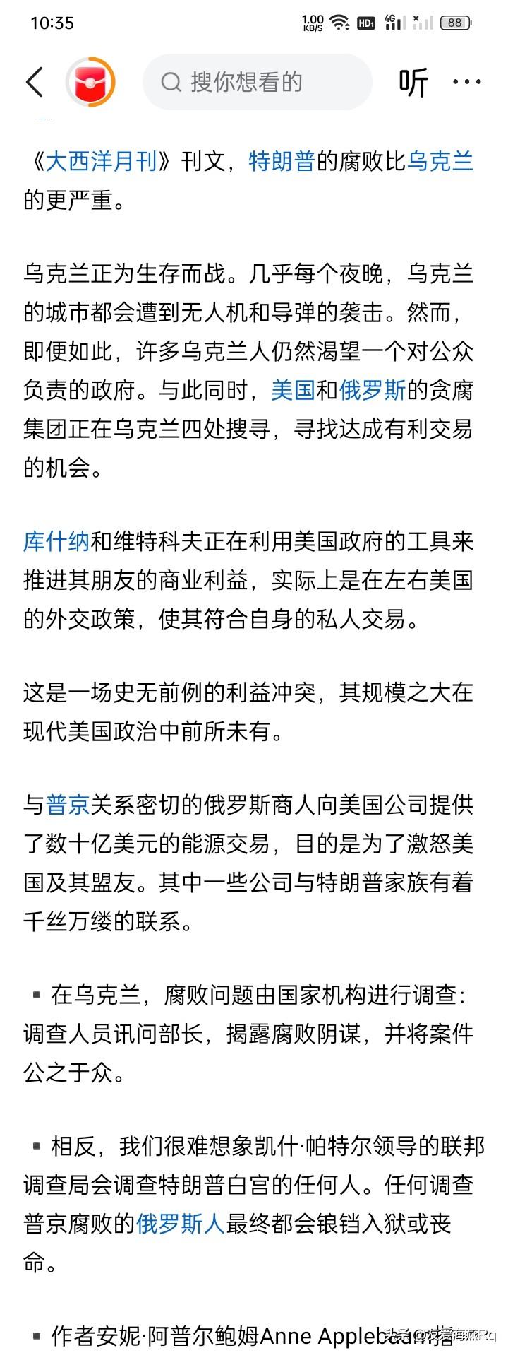 国家腐败比个人腐败危害更大? 当美国总统特朗普指责乌克兰的官员腐败严重,因此要求乌克兰在战争期间进行总统大选的时候,不知道想过没有,好像在美国也存在着严重的、甚至是危害更大的国家腐败。 不顾公平正义,不顾国际法,不惜以他国的领土和主权完整为代价,换取自己国家的利益,这究竟是否一种严重的国家腐败? 当然,作者对这个问题下不了什么结论。但无论是某些人利用一个国家的身份为国家捞取利益,还是某些人利用国家官员的身份为个人捞取利益,只要是采用不择手段,或者非法手段捞取的利益,似乎都应该是一种腐败。