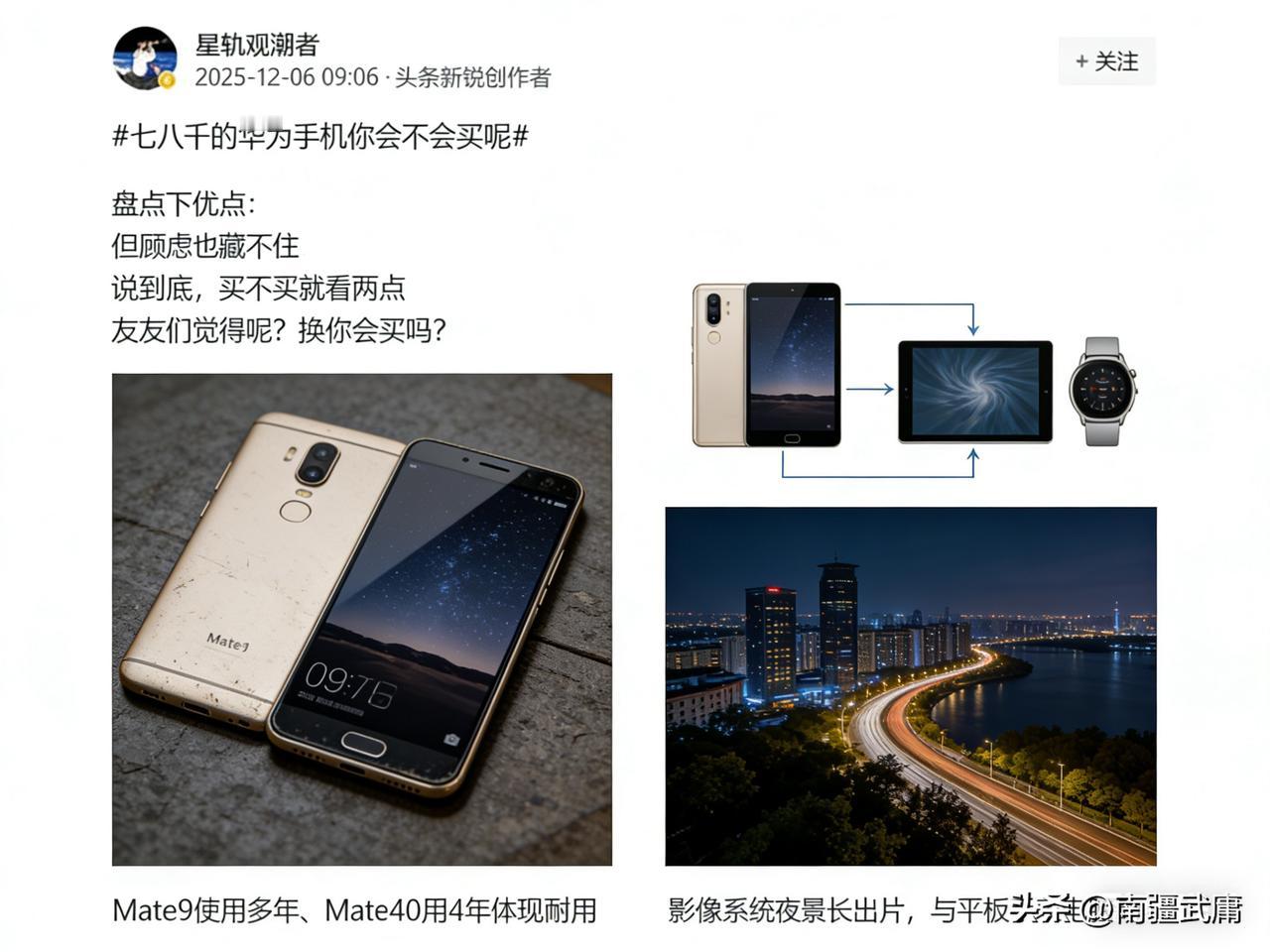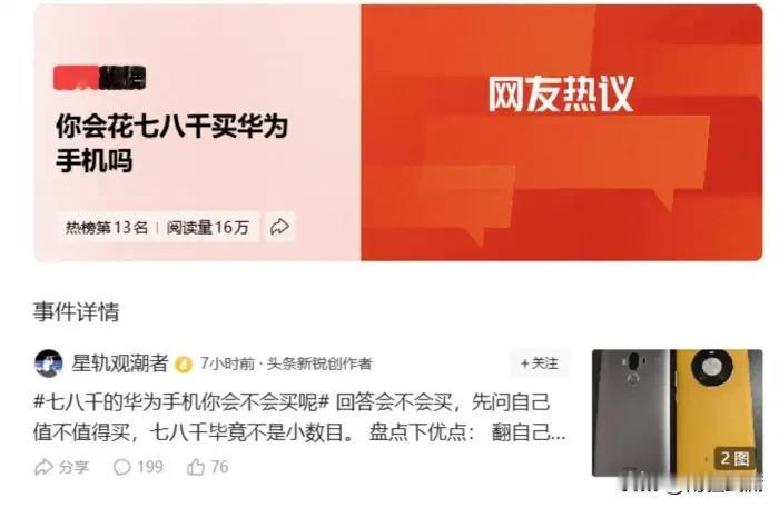 七八千买华为值不值?Mate80热议刷屏,白话唠清这笔账 “Mate80 Pro Max 7999元起,顶配快到9000块”,华为新旗舰上架即冲上热搜第13名,16万网友在线争论。有人晒真机图夸“贵得有道理”,也有人吐槽“这价能买俩安卓机”,到底值不值?用大白话800字说透,不吹不黑。 实拍见真章:硬件质感确实拉满 从网友晒的真机实拍来看,华为旗舰的硬实力肉眼可见。Mate80 Pro Max的曲面屏边框窄到几乎隐形,刷视频、看照片的视觉效果特别通透;背部磨砂机身不沾指纹,拿在手里辨识度拉满。昆仑玻璃3.0版经2米跌落测试后屏幕完好,日常手滑根本不用怕碎屏。 性能实测也很实在,同时开十几个APP切换不卡顿,玩手游半小时帧率稳如磐石;6000mAh大电池撑一天还剩30%电量,搭配100W快充,15分钟就能充到60%,应急补电的速度让人惊喜。这些实打实的硬件表现,是不少人觉得“值”的基础。 核心吸引力:独家功能无可替代 愿意花高价买单的人,核心冲着华为独一份的体验。麒麟9030 Pro芯片搭配鸿蒙6.0系统,实现了软硬深度协同,手机碰电脑就能投屏办公,碰平板就能续播视频,跨设备协同的流畅度,其他品牌目前很难企及。 更关键的是卫星通信功能,实拍藏区测试画面里,没地面信号的深山也能发消息、定位求救,此前还有驴友靠这一功能获救,对经常户外、出差的人来说,这就是“保命神器”。此外,华为承诺五年系统更新,一部手机用五年还能跟上新功能,折算下来每年的使用成本其实并不高。 网友顾虑:价格与体验有明显短板 吐槽的声音也有实打实的理由。7999元的预算,既能买顶配苹果,也能入手一部中高端安卓机加智能手表,对只刷视频、聊微信的普通人来说,华为旗舰的性能明显过剩。 还有网友实拍反馈,Mate80 Pro Max重达239g,单手握持半小时就会手腕发酸,女生装在口袋里还会有坠感。另外,部分预装APP无法卸载占用内存,少数第三方软件适配没跟上、偶尔闪退,这些小问题也让不少人犹豫要不要入手。 最终结论:值不值看需求匹配度 其实这件事根本没有标准答案,核心看使用需求。如果想一部手机用五年、经常户外需要应急通信,或者已经有华为电脑、平板,想体验全场景生态协同,那花七八千买华为就很值;但如果预算有限、日常只用手机做基础操作,又或者看重轻薄手感,那这个价格完全没必要,三千元的中端机就足够满足需求。 说到底,华为卖的不只是手机,还有自研技术和长期使用的安全感。买手机就跟买鞋似的,合不合脚只有自己知道,按需求选择,就不会后悔。