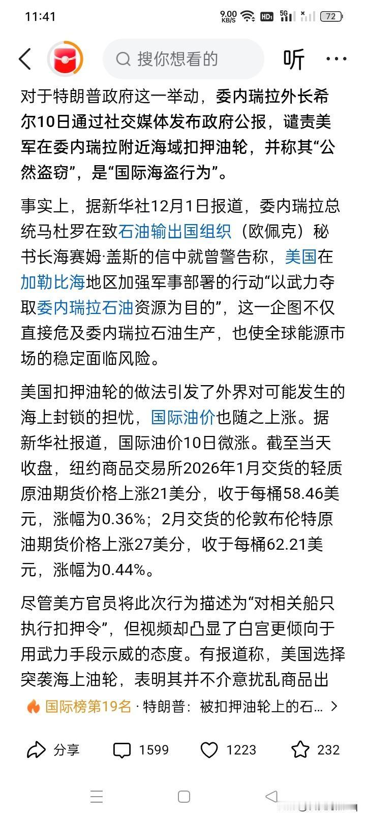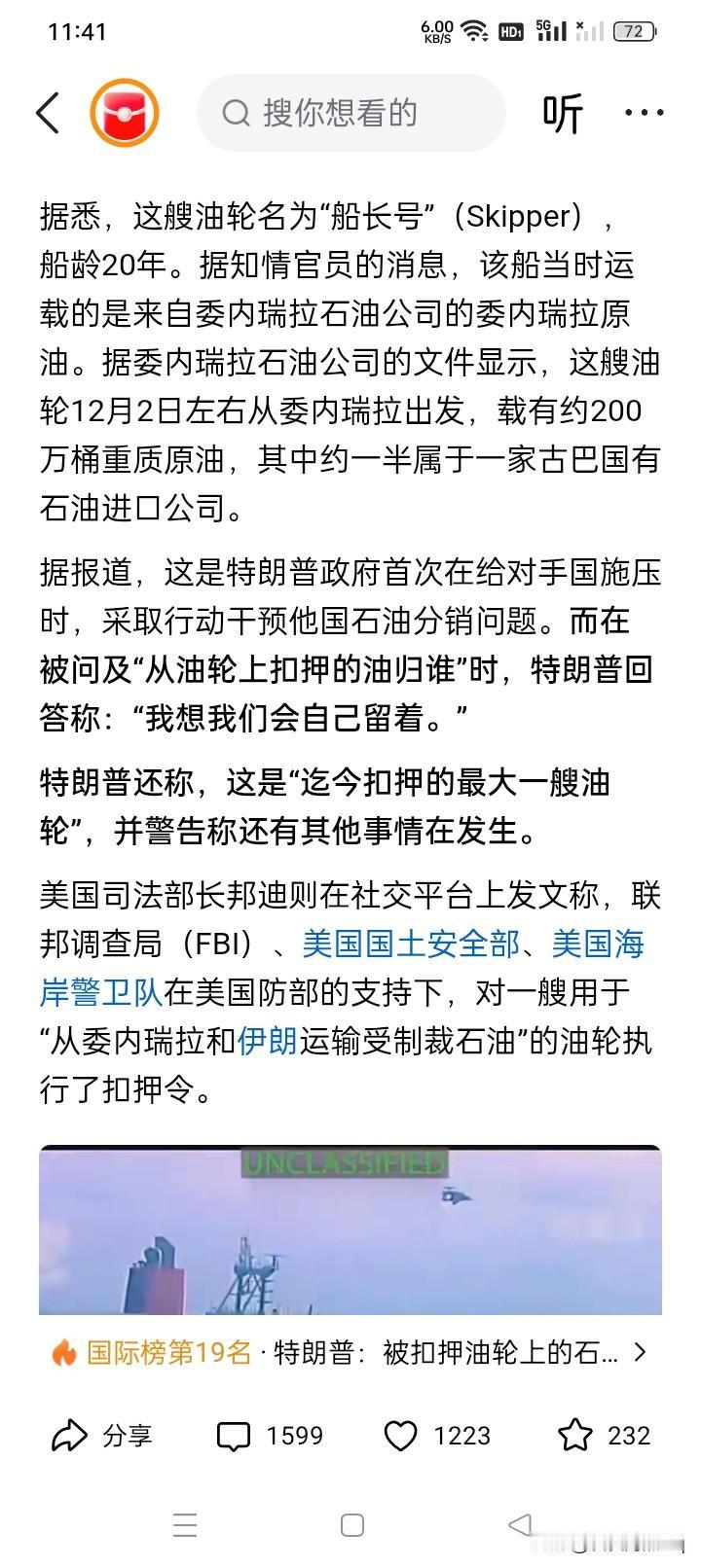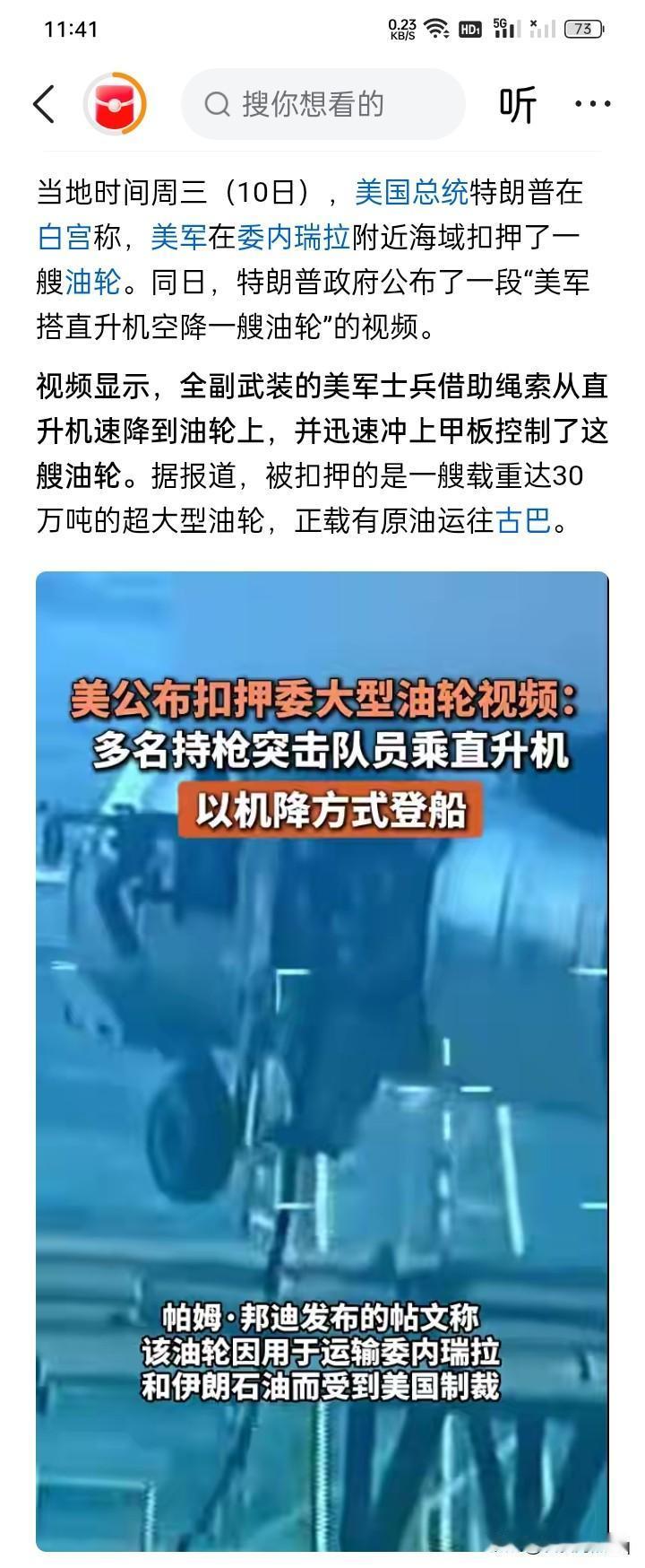 动手抢起来了? 美国总统特朗普在12月10日在白宫亲自声称:美军在委内瑞拉海域扣押了一艘委内瑞拉的超级大油轮。 这艘巨型大油轮装载足足有200万桶、多达30万吨的石油,计划运往古巴。据传闻说,对于如何处理扣押的委内瑞拉油轮上装载的30万吨石油,特朗普似乎已经明确表示:美国将留下来自己使用。 这种情况,本来说好的扣押,似乎一下子成了在光天化日之下赤裸裸的武装抢劫。 已经不是用唯利是图可以形容了,而更像是到了弱肉强食的丛林法则,可以肆意妄为,横行霸道。