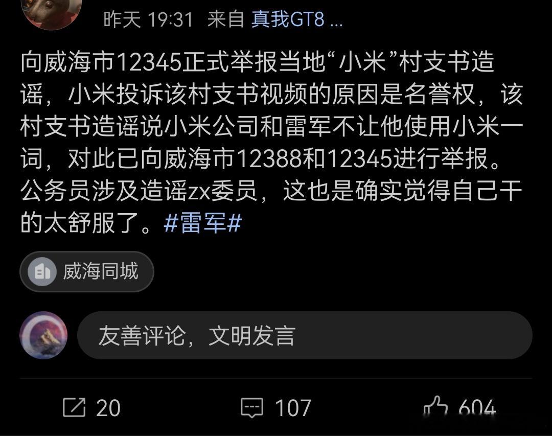 山东村支书的事没太关注,不过还是有人关心的。这不,又是跨区域投诉,又是暗戳戳的说说人家生活奢侈,想要暗示点啥我记得上次说“第一次财经7号前给答复”,也是打了举报电话的。这个群体自己造谣网暴别人的时候从来想不起法律法规,等自己觉得挨欺负了,比谁都知道怎么维权,标准还真是灵活不过监督是监督,别打着监督的幌子行网暴开盒之实,互联网也不是不法之地 村支书卖小米被投诉下架