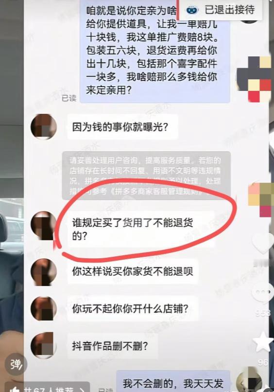 山东潍坊一女子定亲买了5瓶果酒当摆台,礼盒包装丢了,喜字、红丝带也用了,用完申请退货退款,商家拒收之后,女子申请平台介入,退款成功。商家气的把视频发网上要说法,结果被女子举报赔了600,女子让商家删除视频,还说:谁规定买了货,用了,不能退货的?后续网友扒出女子信息,发现女子退款的还不止是果酒。 潍坊高密的李女士,最近因为一场订婚宴彻底成了“名人”。   这场名气不是来自浪漫的仪式,而是源于她对43.9元订婚礼品的“极致利用”。   为了让订婚宴的台面更喜庆,李女士在本地一家婚庆用品网店,选中了5瓶定制款果酒。 这款酒专为喜事打造,瓶身印着醒目的红喜字,搭配配套的红丝带,商家还贴心附赠了定制礼盒和防损泡沫。   订婚当天,这些果酒顺利完成了使命,被整齐摆放在宴会上,陪着新人拍完了所有仪式照片,也招待了到场的亲朋好友。   可没人能想到,李女士在电商平台发起全额退款申请,理由写的是“酒品口感不佳,存在质量问题”,要求商家承担全部退货运费。   经营网店的王先生看到申请时,心里立刻犯了嘀咕,结合理由和时间来看,这酒肯定是被用过了。   他拒绝了退款,并且耐心解释,用于婚宴的物品用过之后,已经失去二次销售价值,不符合退货规则。   让王先生意外的是,李女士态度强硬地绕过他直接申请平台介入,还私自联系快递员,把包裹以运费到付的方式寄了回来。   当快递送到店铺时,王先生拆开包裹的瞬间就傻了眼,5个酒瓶全都开封过,红丝带上残留着未清理干净的酒渍,瓶身也有轻微的磨损,而最初的定制礼盒、保护泡沫早就没了踪影。   这些根本不可能再卖给其他顾客,王先生赶紧拍下照片和视频留存证据,再次与李女士沟通。 可李女士始终拒不承认,一口咬定是商品本身存在质量缺陷,自己使用只是为了验证问题是否属实。   更让王先生无奈的是,平台根本就没有经过核实,直接做出了支持李女士全额退款的裁决。 这一下,王先生不仅亏了果酒的成本,还得自己垫付退货运费,彻底落了个款货两空。 他实在咽不下这口气,就把自己的遭遇拍成短视频发到网上。   这段视频很快被李女士看到,她没有丝毫愧疚,反而直接私信威胁王先生:“你敢曝光我,我就不让你好过。”   威胁的话刚说完,王先生的店铺就遭遇了“报复性攻击”。   很多个小号集中下单,然后收到货后就退货退款,并且给出恶意差评,有些评论里还带着明显的挑衅意味。   更过分的是,有订单的收货人姓名里夹杂着侮辱性词汇,客服沟通时对方还故意说难听话激怒工作人员,等王先生被气到说出敏感词,对方马上截图投诉他服务态度恶劣。   平台核查都判定王先生违规,累计罚款600元,这么一来,李女士不仅白用了订婚果酒,还间接从商家身上“赚”了一笔。   王先生不甘心就这样吃哑巴亏,他整理了所有证据,包括聊天记录、商品状态照片、恶意差评截图等,再次发布视频详细讲述整件事的来龙去脉。   这次他格外谨慎,只提到“山东潍坊高密”,没有泄露任何具体隐私信息,可即便如此,视频还是被李女士以“侵犯隐私”为由举报下架。   好在视频下架前已经吸引了不少网友关注,大家顺着“高密”这个关键线索深挖,很快就扒出了李女士的具体住址,以及她所在的工作单位。 更让人意外的是,另一位电商店主看到这件事后,也分享了自己的相似经历。   他说自己曾收到过一个山东高密的订婚礼服退货单,网友提醒他核对地址,结果发现退货地址正是李女士所在的驿站,原来她不仅白嫖果酒,连订婚礼服都想用完就退。   事情闹到这个地步,李女士所在的小区和物业公司都跟着受了牵连,网友们纷纷猜测,她的未婚夫大概率已经知道了这件事。   订婚本是一辈子的大事,图的就是吉利和诚信,可李女士为了43.9元,不仅白嫖商品,还恶意报复商家,这样的行为实在让人难以接受,也让人忍不住担心她未来的婚姻生活。 后来王先生发布了最新进展,他说向平台申诉罚款后,对方偷偷返还了300元。   而李女士那边,不仅没意识到自己的错误,还向市场监督管理局举报了王先生的营业执照,甚至报了警,声称自己遭到了网暴。   由于涉案金额只有43.9元,达不到警方立案标准,王先生无法通过法律途径维权,只能选择每天录制一条“道歉视频”,名义上说是给李女士的“份子钱”,实际上是想通过这种方式让更多人知道事情的真相。   作为一名中小商家,王先生的维权之路格外艰难,平台的倾向性保护让他有理说不清,不仅损失了商品成本,还被罚款,实在让人唏嘘。 买卖双方本应相互尊重,消费者在享受合法权益的同时,也该守住诚信底线,不能为了一点小利就肆意损害商家利益。