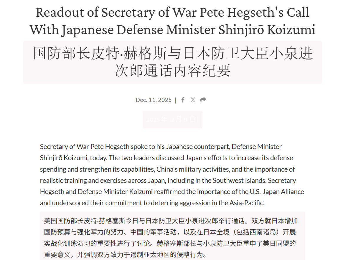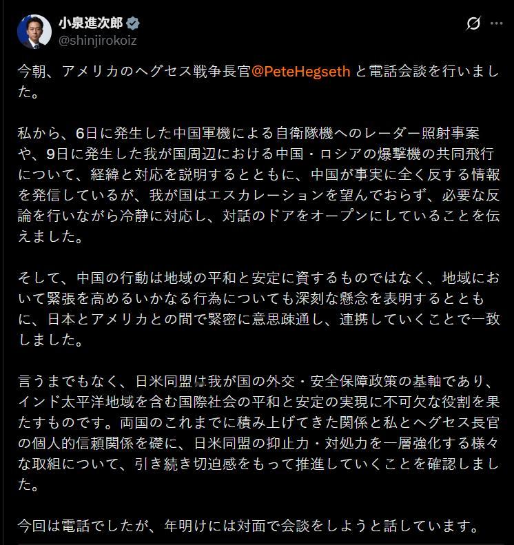 🔻小泉进次郎跟美国国防部长赫格赛斯打电话说“5555我们被照了”,又说“我们不希望局势升级,将在进行必要反驳的同时冷静应对,始终保持对话大门敞开”。🔻但是,日方发布的通话内容,和美方发布的通话内容并不一致。🔻日方内容多了一条:“我们一致认为……”🔻美方内容里压根没这一条。日本前将领称珍珠港事件是美国栽赃热点现场海外新鲜事