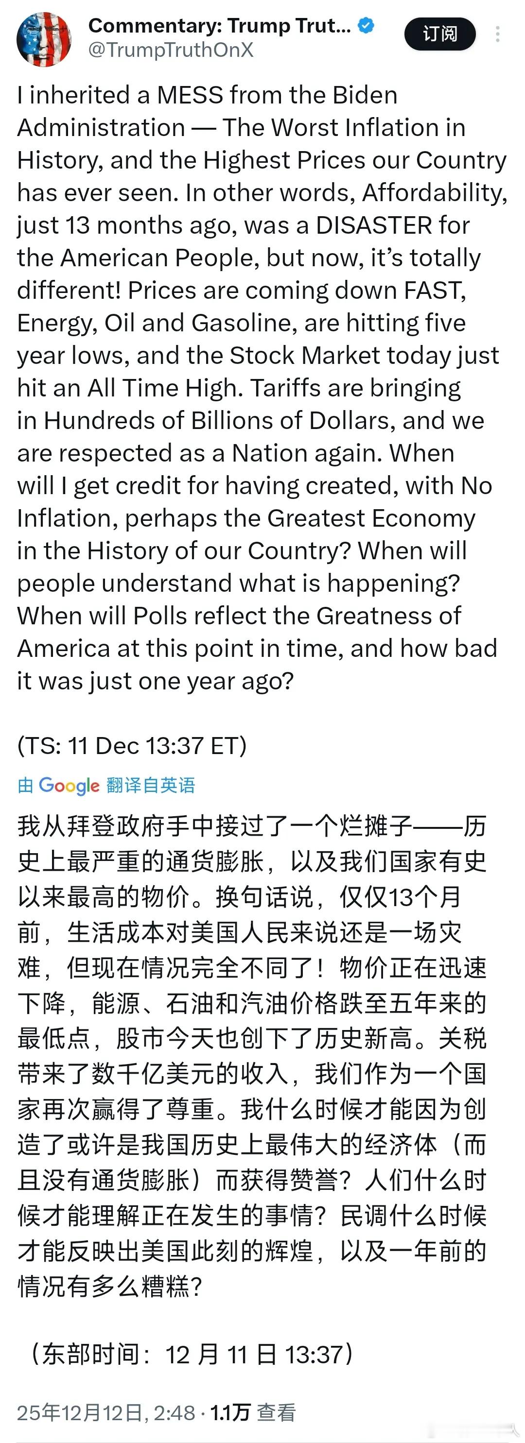 特朗普又甩锅拜登:我从拜登政府手中接过了一个烂摊子——历史上最严重的通货膨胀,以及我们国家有史以来最高的物价。换句话说,仅仅13个月前,生活成本对美国人民来说还是一场灾难,但现在情况完全不同了!物价正在迅速下降,能源,石油和汽油价格跌至五年来的最低点,股市今天也创下了历史新高。关税带来了数千亿美元的收入,我们作为一个国家再次赢得了尊重。我什么时候才能因为创造了或许是我国历史上最伟大的经济体(而且没有通货膨胀)而获得赞誉?人们什么时候才能理解正在发生的事情?民调什么时候才能反映出美国此刻的辉煌,以及一年前的情况有多么糟糕?实际上,特朗普的关税战导致美国现在通货膨胀比拜登时期高。