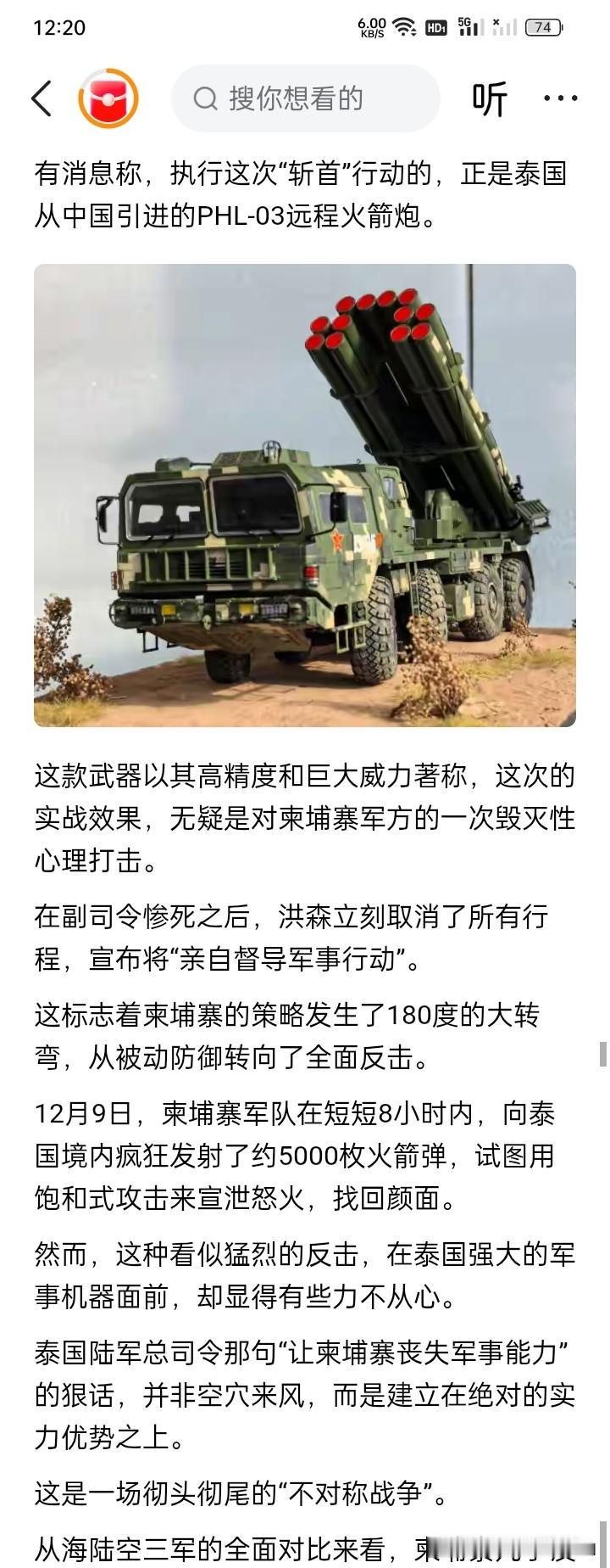 创纪录的火箭弹? 在柬埔寨茂密的丛林中,12月9日的时候,一枚泰国发射的火箭炮弹呼啸而至,在一群军人中间爆炸。大概很少有人想到,这一枚火箭炮弹不仅干掉一个柬埔寨军队里的中将副司令,还让随行的46名其它官职大小不等的军人命丧此丛林。 更让人颇为惊异的是,发射这枚火箭弹的火箭炮,好像是泰囯从中国进口PHL-03远程火箭炮。 泰国与柬埔寨在前些时候,曾经武装冲过一段时期,但美国总统特朗普曾声称,在他的干预下,泰国与柬埔寨的军事冲突结束了。大概特朗普也没有想到吧,现在武装冲突又再起,并且一炮干掉一个中将副司令。