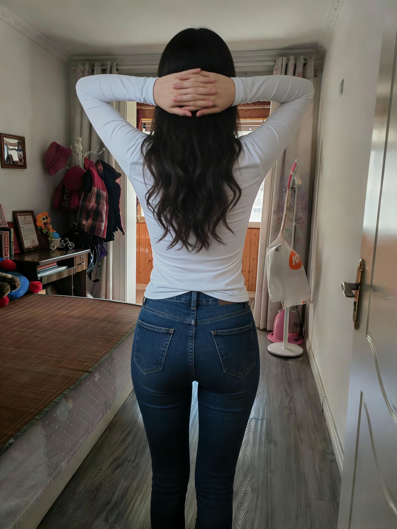 白衫青裤立室中,卷发垂肩意态慵。 一绾纤腰藏秀色,背影犹胜面芙蓉。