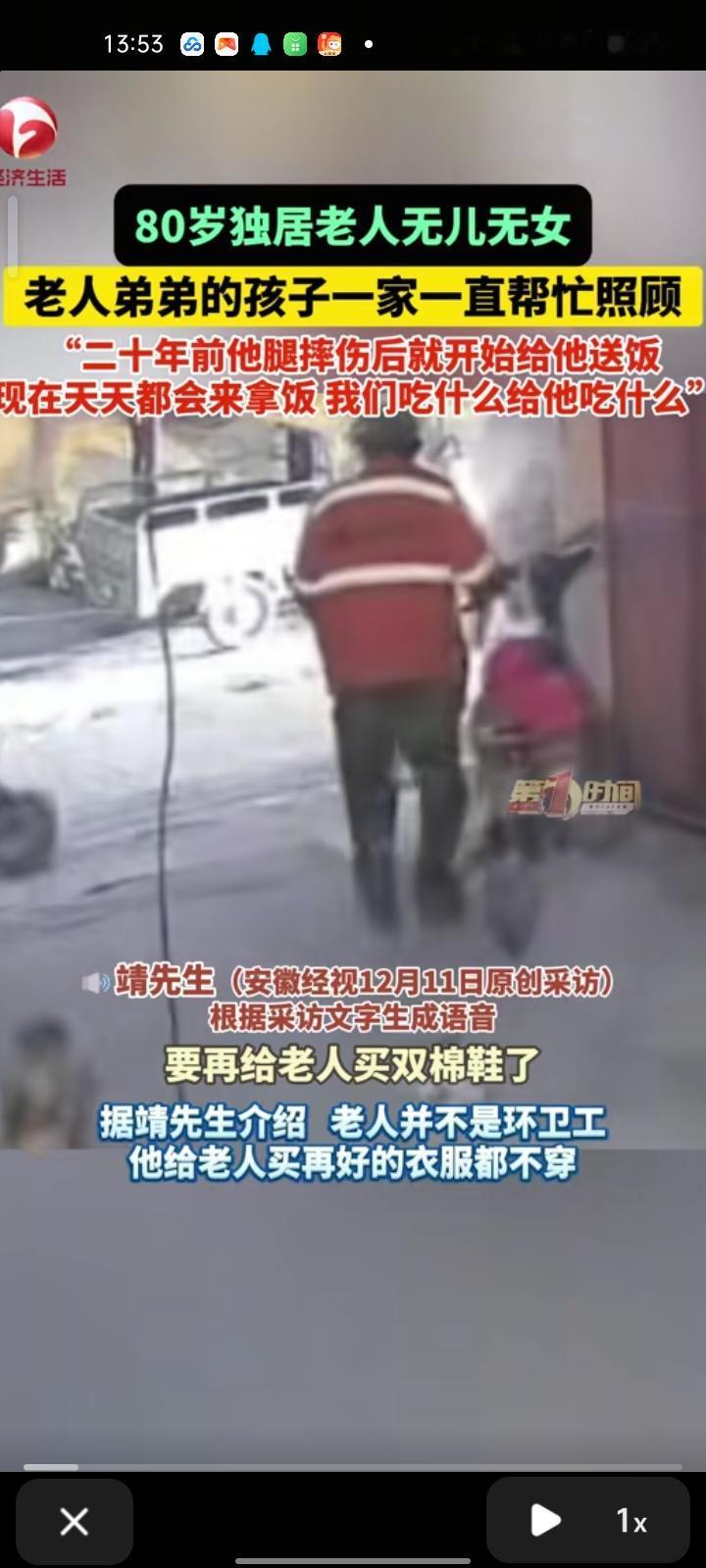12月10日,江苏徐州。80岁独居老人无儿无女,老人弟弟的孩子一家帮忙照顾。 靖先生介绍,老人并不是环卫工,他给老人买再好的衣服都不穿,一年到头都穿着环卫工的衣服,其实是老人自己捡来的。“二十年前他摔伤后就开始给他送饭,现在天天都会来拿饭,我们吃什么就给他吃什么”。