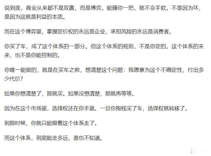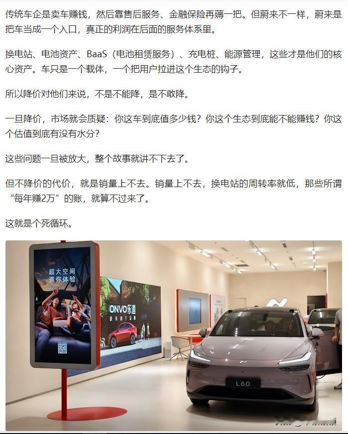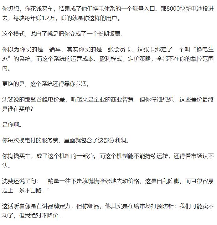 近期,乐道在新能源汽车市场内卷、多家车企降价的背景下,明确表态坚持不降价,其核心押注的是换电商业模式。 乐道计划投放 8000 块新电池,靠谷峰电价差赚取利润,一块电池一年预计能赚 1.2 万 - 1.3 万,而这些利润实则来自车主的换电服务费。 对消费者而言,买车后电池不归自己所有,只是拥有能源使用权,相当于成为了乐道换电生态的 “长期饭票”。 乐道不降价的底层逻辑是其盈利不靠卖车,而靠换电等后续服务体系,可一旦销量低迷,换电站周转率下降,这套盈利账就会失衡,其换电生意的未来也充满变数。 原文来自:牛顿顿顿《不降价反薅用户?乐道的换电生意,到底在赌什么?》