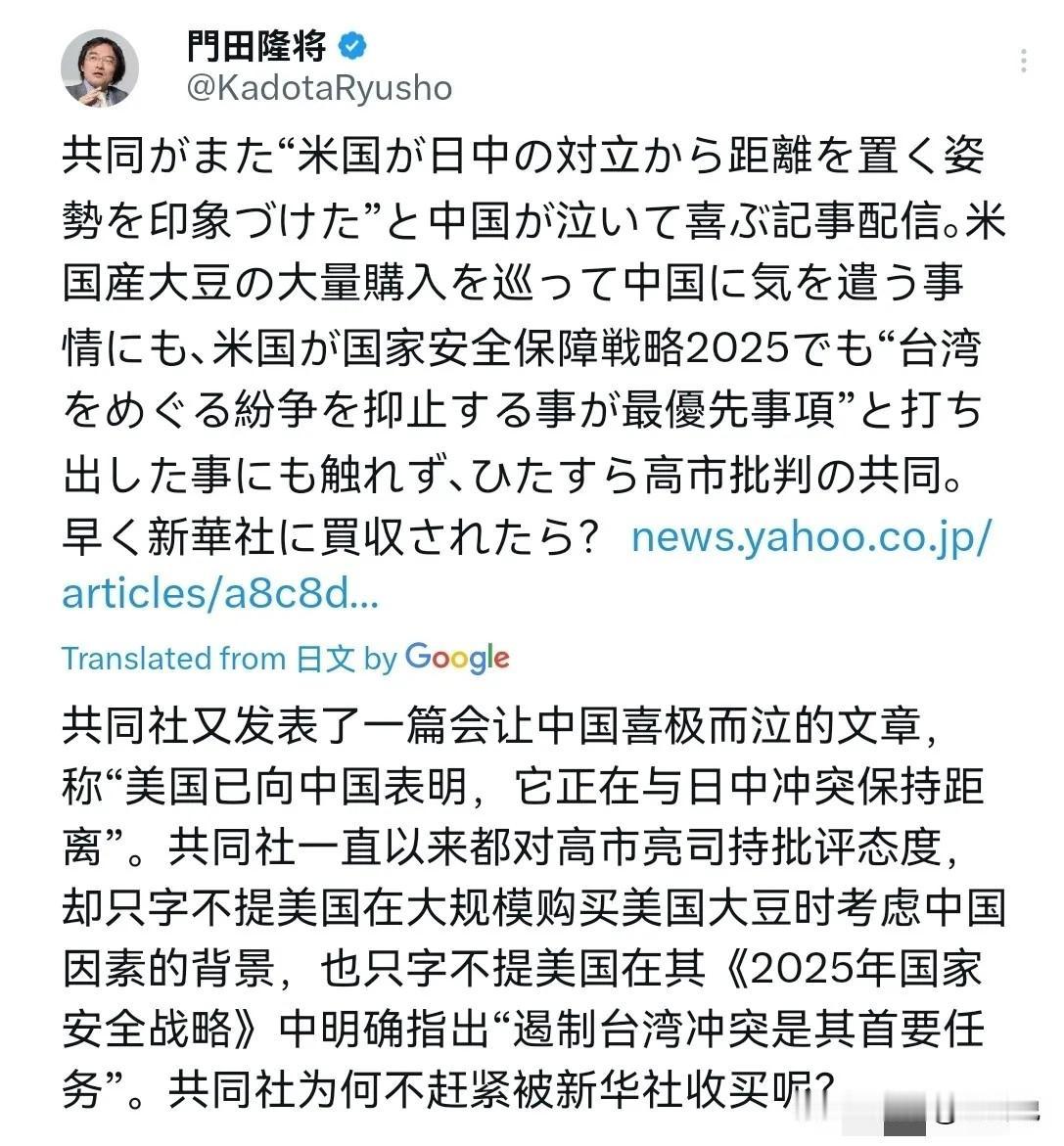 在美国表态之后,日本右翼分子门田隆将破防了!12月12日,门田隆将写到,共同社又发表了一篇令中国喜极而泣的文章,称美国已经向中国表明,美国将在日中冲突中保持等距。 共同社甚至没有提到对中国大规模购买美国大豆的背景,也没有提到美国在《国家安全战略2025》中表示“防止台湾冲突是其优先事项”,并继续批评高市早苗。为什么共同社不早点被新华社收购呢? 门田隆将的这番抱怨,表面上看是气共同社的报道“不争气”,深层次其实是日本一部分右翼势力面对当前国际格局巨变时,一种不适应、不甘心又无可奈何的集中爆发。 首先,他核心的恼火点在于,认为共同社的报道“美化了”美国的立场,说什么美国在日中冲突中会“保持等距”。这让他觉得共同社像是在帮中国说话。 但实际情况可能恰恰相反,共同社的报道,或许只是更冷静地反映了一个让日本右翼不太愿意接受的现实:美国当下的对日支持,远没有他们期望的那么“铁杆”和“无条件”。 这不是共同社在编故事,而是有实实在在迹象的。比如,特朗普政府近期确实在贸易问题上几次点名批评日本,说盟友在“占美国便宜”。同时,面对日本首相高市早苗在台湾问题上的激进言论(比如暗示要武力介入),白宫也确实没有站出来公开表示支持,反而显得比较冷淡。 美国最新的国家安全战略报告里,虽然强调要阻止台海冲突,但也更强调让盟友(比如日本)自己多承担责任、多出钱出力,而不是美国大包大揽。 这种种迹象叠加起来,传递给东京的信号就是:美国不想被日本单方面“拖下水”,尤其是在可能与中国发生直接冲突的极端情况下。 所以,“保持等距”这个说法,可能是一种比较含蓄的表达,核心意思是美国会优先考虑自己的国家利益,不会无条件为日本的任何冒险行为背书。 共同社只是把这个微妙的信号报了出来,但在门田隆将这样的右翼分子听来,就格外刺耳,觉得是“长他人志气,灭自己威风”。 其次,他抱怨共同社没提中国大规模购买美国大豆的背景,这其实有点“甩锅”给媒体的意思。中国根据市场需求购买美国大豆,主要是商业行为,但这背后也折射出中美之间复杂的相互依存关系。 特朗普政府非常看重农产品出口和选票,而中国是这个市场上的大买家。这意味着,美国在处理对华关系时,不可能不考虑巨大的经济利益。 日本右翼可能希望美国能抛开所有经济利益,全心全意地支持他们与中国对抗,但这显然不现实。共同社的报道可能没有特别去展开这个经贸背景,但这或许是因为在他们看来,报道的重点是战略安全层面。 门田隆将的抱怨,反而透露出一种焦虑,即担心美国会因为实实在在的经济利益,而在战略上对中国有所顾忌,从而削弱对日本的支持。 至于他讽刺共同社“为什么不被新华社收购”,这纯粹是情绪化的气话,也反映出一部分日本右翼在事实不符合自己预期时,一种典型的“甩锅”思维:不是我的观点有问题,是报道事实的媒体“屁股坐歪了”。 其实,共同社作为日本主要的通讯社,其报道总体上是遵循专业准则的。当它的报道开始反映出美国政策的微妙变化时,恰恰说明这种变化是真实存在且值得关注的,而不是什么“亲中”的臆想。 总的来说,门田隆将的“破防”,生动地展示了日本右翼势力当前面临的一个核心困境:他们一方面极力想拉拢美国来对抗中国,甚至不惜在台湾问题等中国核心利益上进行危险挑衅;但另一方面,他们发现自己最大的靠山美国,其战略算计远比他们想象的更精细、更以自我为中心。 美国当然希望利用日本来牵制中国,但它绝对不愿意被日本“绑架”去和中国“拼命”。当共同社这样的媒体将美国这种“谨慎”甚至“保持距离”的姿态客观报道出来时,就等于戳破了部分日本右翼幻想出来的“美日铁盟无条件抗中”的泡沫,他们自然会感到气急败坏。 所以,这件事的关键不在于共同社说了什么,而在于国际政治的现实就是如此复杂和残酷,任何一个国家,如果妄想牺牲他国核心利益来谋取自身不正当利益,甚至想把盟友当枪使,最终都可能发现自己会陷入孤立无援的境地。门田隆将的抱怨,更像是一面镜子,照出的正是这种战略误判带来的尴尬和失落。