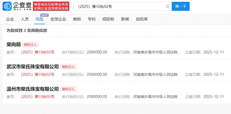 【柴怼怼及其珠宝公司被执行208万】法院强执柴怼怼及其公司208万企查查APP显示,近日,柴向前(柴怼怼)、温州市柴氏珠宝有限公司、武汉市柴氏珠宝有限公司新增1条被执行人信息,执行标的208万元,执行法院为河南省许昌市中级人民法院。 据此前报道,网红“柴怼怼”等人涉嫌生产、销售伪劣产品案中,柴向前及妻子肖某已被正式逮捕。