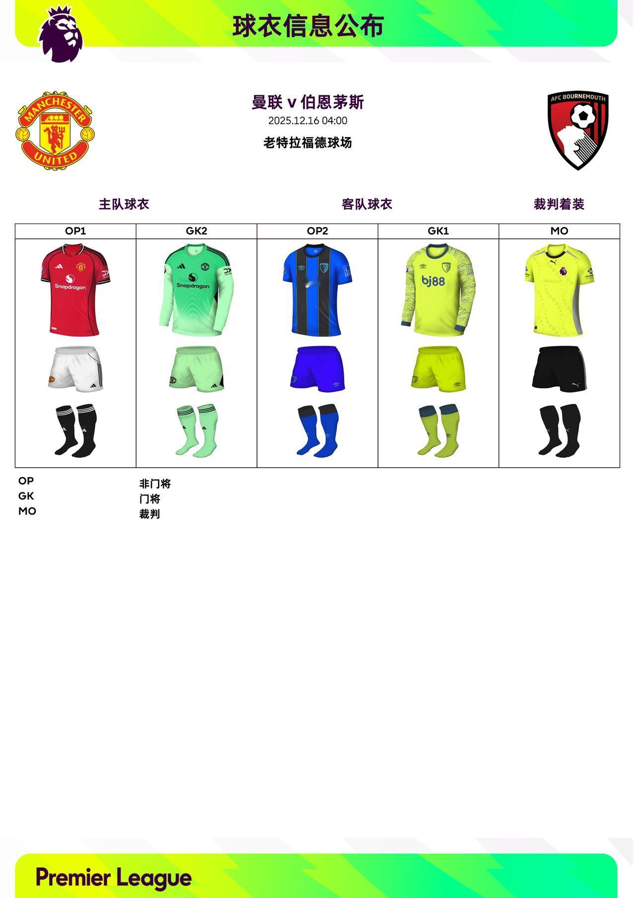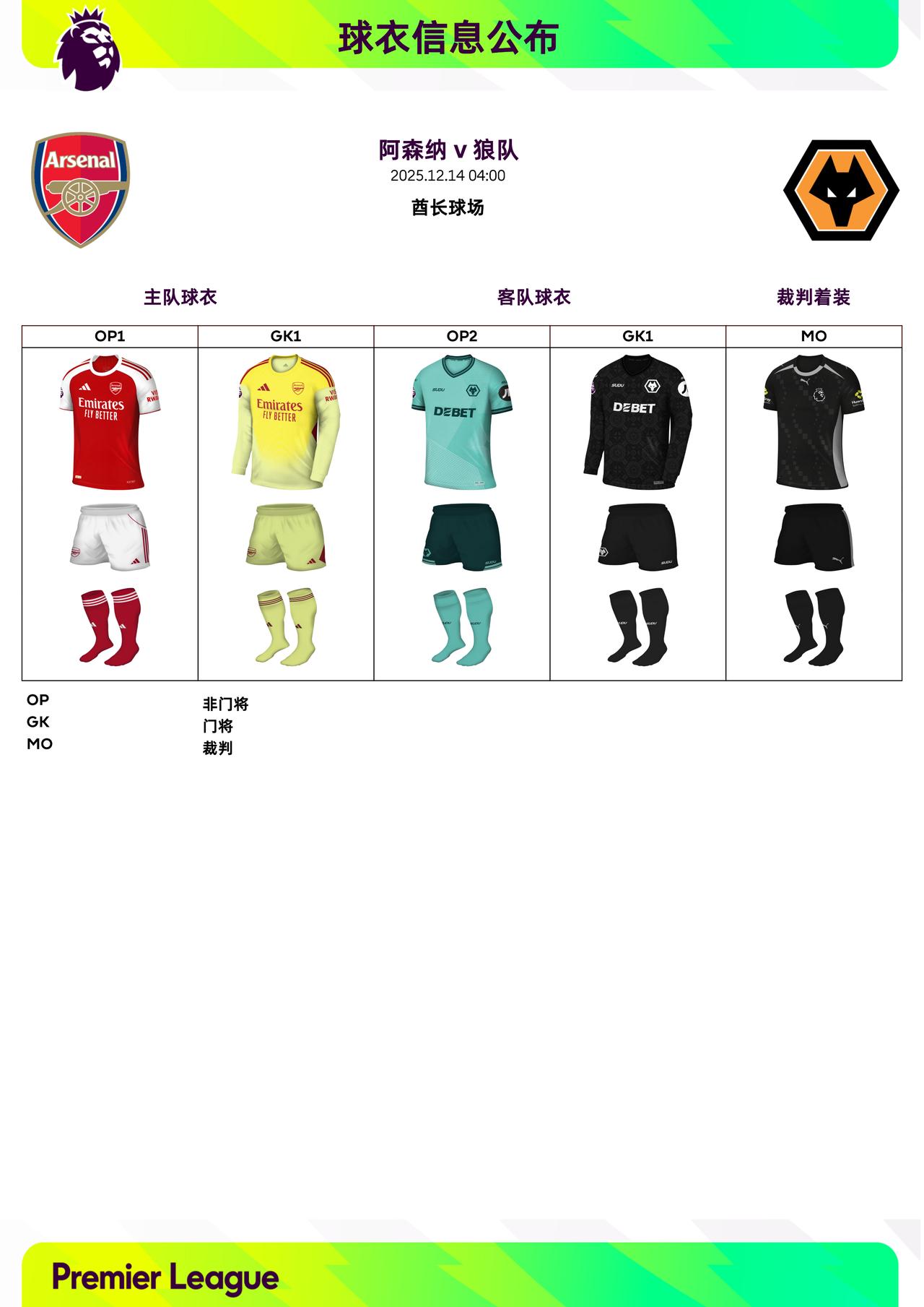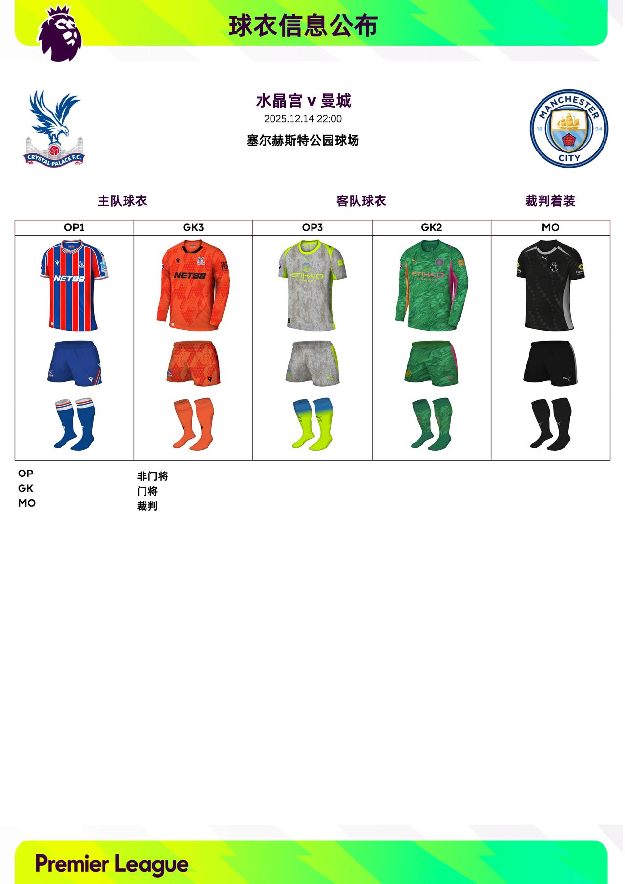 2025/26赛季英超联赛第16轮球衣信息: ◉ 焦点战——水晶宫 V 曼城 ,蓝月军团身穿银灰色第二客场球衣