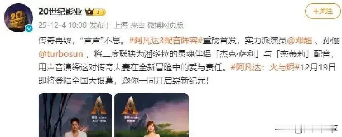 12月4日一公布,《阿凡达3:火与烬》的中文配音阵容就炸锅了!邓超和孙俪这对老搭档又回来给杰克夫妇配音,黄轩继续当岛礁族老大特诺瓦里,章子怡则再度化身女性首领罗娜尔。四位大咖齐上阵,啃纳美语啃得牙疼,就为让潘多拉的冒险听起来更接地气。导演詹姆斯·卡梅隆还特意撂话:这部片子零生成式人工智能,全靠真人一砖一瓦堆出来。 好莱坞到处嚷嚷AI省钱裁员,卡梅隆偏不凑热闹。他觉得用机器生硬拼情绪,观众一听就出戏——那股子心跳般的张力,AI再快也抓不住。结果呢?内地预售三天就冲到3800万人民币,想看人数破50万,IMAX厅直接占四成席位。前两部加起来在中国卷走34亿,这次火山新场景用真水真火拍,演员泡热水里扛蒸汽,银幕上那股热浪直扑脸,值不值票价一目了然。 这操作太有门道了。明星阵容自带流量,配音团队还得泡海水练舌头,等于把诚意拆解成看得见的努力。卡梅隆最近访谈里直言,AI工具能帮点忙,但替换真人表演太吓人了,得守护艺术的灵魂。市场也给面子,中国2025票房正爬坡,这片子开周末预计9到10亿人民币起步,证明观众就吃这套:别光图便宜,电影得有血有肉。 特效再炫,少了人味儿就空洞。卡梅隆这手,教同行醒醒神——多投点心血,钱自然滚滚来。潘多拉的火山危机,等着大伙儿亲眼瞧瞧那份真挚的冲击