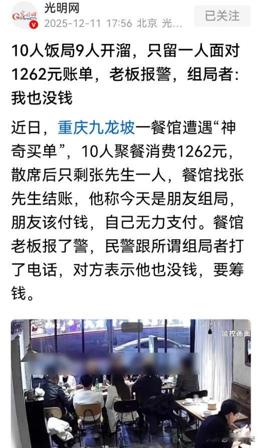 重庆,有位男子和9个朋友相约下馆子,点了1262元的饭菜。酒足饭饱后,9人趁男子上厕所偷偷开溜,留下男子一人。男子耍赖称自己没钱,还说饭是朋友组的局,拒绝买单。老板无奈报警,警方联系组局者,对方也表示没钱。男子最后写了欠条承诺次日结账,第二天男子反悔,说自己不是饭局的组织者,不应该付钱。 据光明网报道: 张先生,平时就喜欢热闹,当天他接到个朋友电话,说大家好久没聚了,约着一起下馆子搓一顿。 张先生一听,那必须得去,二话不说就答应了。 到了约定的餐馆,张先生一看,好家伙,连自己一共10个人。大家围坐在一起,有说有笑,气氛那叫一个融洽。 点菜的时候,也没人客气,各种好菜点了一大桌,什么山珍海味,特色小吃,统统安排上。时间不长菜就上齐了,大家一边吃一边聊,喝着小酒,别提多开心了。 酒过三巡,菜过五味,张先生感觉肚子有点胀,就起身去卫生间,等他从卫生间回来,整个人都懵了。 原本热热闹闹的餐桌,现在只剩下满桌的杯盘狼藉,刚才还在一起吃饭的9个朋友,包括那个组局的朋友,全都不见了踪影。 张先生正纳闷,服务员拿着账单过来了,说:先生,您这桌一共消费了1262元。 张先生一听,他摸了摸自己的口袋,发现根本没带那么多钱。他赶紧解释说:这饭不是我组的局,是那个朋友组的,应该他买单。 服务员可不管这些,说:不管谁组的局,您在这吃饭就得付钱。 张先生耍起了赖,说:我没钱,你们找组局的人要去。 服务员没办法,只好把老板叫了过来。老板来了之后,也是好说歹说,希望张先生能把钱付了。 可张先生就是死活不肯,一口咬定自己没钱,让老板找组局的人。 老板一看这情况,知道跟张先生说不通,就报了警。 民警来了解完情况后,联系了那个组局的朋友,组局的朋友在电话里说:我也没钱,我也没想到会这样。 民警也没办法,只能让双方协商解决。 最后,在民警的协调下,张先生没办法,只好写了一张欠条,承诺第二天一定把钱结清。 老板虽然心里不太乐意,但也没办法,只能先让张先生走了。 第二天,老板在店里等着张先生来结账,可是左等右等,一直等到中午,也没见张先生的影子。 老板又给张先生打电话,电话倒是打通了,可张先生却反悔了,说:我昨天那是被逼无奈才写的欠条,我现在还是没钱,这钱我付不了。 老板一听,这算怎么回事,这不是耍人玩吗? 老板又联系了那个组局的朋友,希望他能出面解决这个问题。 组局的朋友却说:这事跟我没关系,是张先生自己耍赖,你们找他去。 老板夹在中间,真是左右为难。 有人觉得张先生太不地道了,朋友之间聚餐,怎么能耍赖不买单呢,这不是破坏朋友之间的感情吗? 以后谁还敢跟他一起吃饭,组局的朋友也有责任,既然是你组的局,就应该提前安排好买单的事情,不能出了问题就推得一干二净。 张先生在聚餐后,以自己不是组局者且没钱为由拒绝买单,这种行为在法律上可不能被认可。 根据《民法典》第五百零九条规定,当事人应当按照约定全面履行自己的义务。 张先生参与了聚餐活动,享受了餐馆提供的餐饮服务,这就和餐馆形成了一种合同关系,有支付餐费的义务。 张先生耍赖不买单,属于没有履行自己的合同义务,是一种违约行为。餐馆老板有权要求张先生支付餐费。而且张先生写欠条后又反悔,这更是违背了诚实信用原则,进一步加重了自己的违约责任。 朋友聚餐,组局者是否应该承担买单的主要责任? 按照常理来说,组局者有一定的责任,毕竟是你发起的活动,应该提前考虑好费用的问题。 但也不能说完全由组局者承担,大家一起吃饭,都应该有一定的担当。 如果组局者提前说明了是AA制,或者大家商量好了费用分摊方式,那就应该按照约定来。 张先生耍赖不买单的行为,是否可取呢? 这肯定不可取的,朋友之间相处,最重要的是诚信和担当。 就算自己真的没钱,也应该提前和朋友沟通,而不是耍赖逃避。 这样做不仅会破坏朋友之间的感情,还会让自己失去别人的信任。 根据《民法典》第五百七十七条规定,当事人一方不履行合同义务或者履行合同义务不符合约定的,应当承担继续履行、采取补救措施或者赔偿损失等违约责任。 老板可以先和张先生协商,让他支付餐费,要是协商不成,老板可以拿着欠条等证据,提起民事诉讼,要求张先生支付餐费以及可能产生的逾期利息等损失。 您对这件事有什么看法呢?