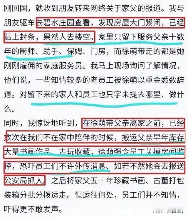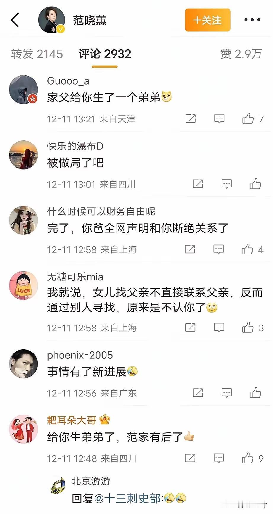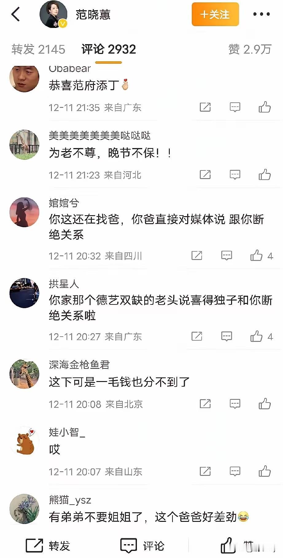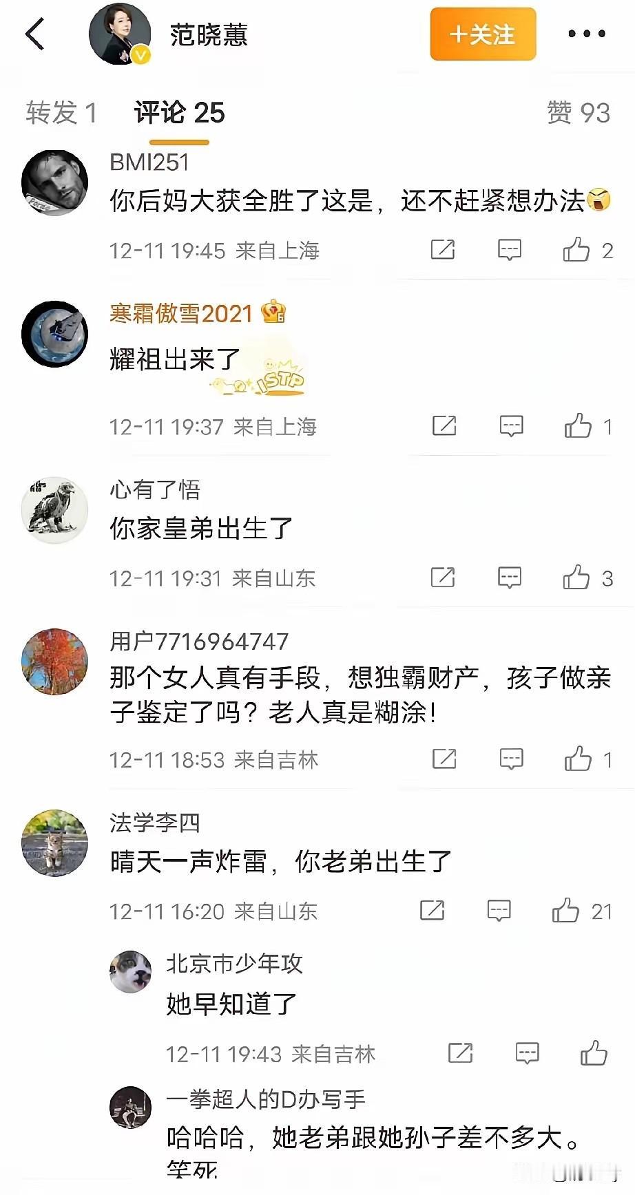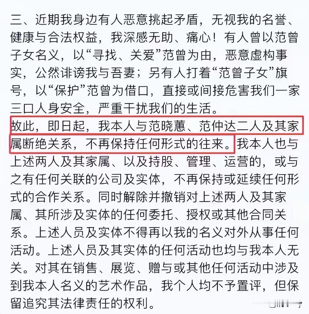 87岁画家范曾女儿范晓蕙的评论区已经炸了!明明该抱重孙的年纪,老父亲现在又喜得贵子,50多岁的女儿多了个小弟弟! 不过已经不重要了,因为老父亲已经宣布和女儿以及女儿的所有亲属断绝关系了! 原因应该是老父亲认为是女儿挑唆矛盾,干扰了老父亲一家三口的正常生活,甚至于还威胁到了一家三口的人身安全! 所以和女儿断绝了父女关系,甚至于都不允许女儿再代理他的作品,如果发现将会追究法律责任! 通过范曾的声明可以看出之前说徐萌卷走财产的人,不是女儿就是继子了,不然他也不会做得这么决绝! 87岁了终于有了儿子,所以其他全是浮云,包括亲生女儿!