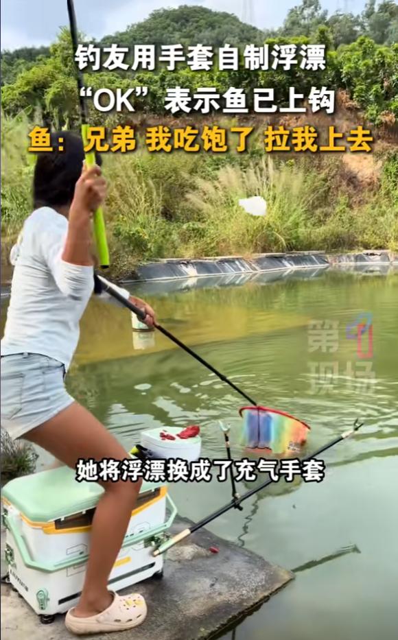 “人怎么能这么聪明!”近日,湖南怀化,一女子钓鱼时,为了能立马知道鱼上钩,于是将充气手套的拇指和食指缝在一起,做了个浮漂,只要鱼一咬钩,塑料手套就会立马在水中站起来,呈现一个“OK”的手势。鱼:我还得给她说一声。 近日湖南怀化一位女子的钓鱼神操作,在本地钓友圈里传疯了。这位爱钓鱼的女子,每次去河边垂钓都有个小烦恼,总担心错过鱼上钩的瞬间,要么盯着浮漂盯到眼睛发酸,要么稍微分心就错失提竿时机。 思来想去,她竟琢磨出一个低成本又好用的妙招,用一只普通的充气塑料手套,就解决了所有问题,连围观的钓友都忍不住为她点赞。 怀化本地河汊多,不少钓友都爱来河边休闲钓。这位女子常去的河段水色偏浑,传统浮漂的信号总不好捕捉,好几次鱼上钩都没及时发现。多试了几次后,她就结合这里的垂钓环境,琢磨出了这个接地气的办法。 她的制作方法简单到让人拍案叫绝,找一只常见的一次性充气塑料手套,先把里面的空气排净,再用打气筒轻轻充入少量气体,确保手套能浮在水面又不会过于鼓胀。 关键一步是用细棉线把手套的拇指和食指紧紧缝在一起,让这两根手指自然呈现出“OK”的手势造型,其余三根手指则顺势收拢固定。最后在手套的手腕处系上鱼线,再连接好鱼钩和铅坠,一个独一无二的“OK手势浮漂”就大功告成了。 这招用起来特别直观,充气后的手套能稳稳浮在水面,平时就平铺着,一点不显眼。可只要鱼一咬钩,拉扯鱼线的劲儿就会把手套带得立起来,缝好的拇指和食指刚好摆出“OK”手势,哪怕离得远也能一眼瞅见。 围观的钓友都笑开了,调侃说这哪儿是钓鱼,分明是鱼上钩后得专门给她“比个手势报信”,难怪大家都打趣“鱼:我还得给她说一声”。 钓鱼的人都知道,盯浮漂最费眼,尤其是新手或者视力不太好的,很容易错过提竿时机。女子这创意刚好解决了这个麻烦,白色的塑料手套在水面上特别醒目,比普通浮漂好认多了。 更有意思的是“OK”手势的造型,信号一眼就能懂,就算是第一次见的人,也能立马知道鱼上钩了。 其实民间钓友里从不缺这种巧思,大家都爱用身边的小东西改造钓鱼装备。有的用空矿泉水瓶做浮漂,有的拿泡沫块改信号器,都是低成本又好用的招。 怀化本地也有钓友试过用芦苇杆、柚子皮做浮漂,不过女子这充气手套的点子,多了份趣味性,不少人照着做了之后都说管用,钓鲫鱼这种咬钩轻的鱼时,信号比传统浮漂还灵。 最关键的是,一次性充气手套随手就能买到,成本特别低。女子做的时候还特意控制了充气量,既保证手套能浮起来,又不会因为太鼓影响灵敏度,鱼轻轻一咬钩就能带动它,这份细致让这个小发明更实用了。 当天女子用这个自制浮漂垂钓时,吸引了不少路过的钓友围观。大家看着水面上的塑料手套,一旦有鱼咬钩就立马“站起来”比出“OK”手势,都忍不住哈哈大笑。 短短一下午时间,她就钓上了好几条半斤左右的鲫鱼,比平时用传统浮漂的收获还要好。这种不依赖专业装备,靠自己动手解决问题的思路,也让不少钓友受到启发,纷纷表示要回家试试这个妙招。 对此,你们有什么看法,欢迎评论留言~