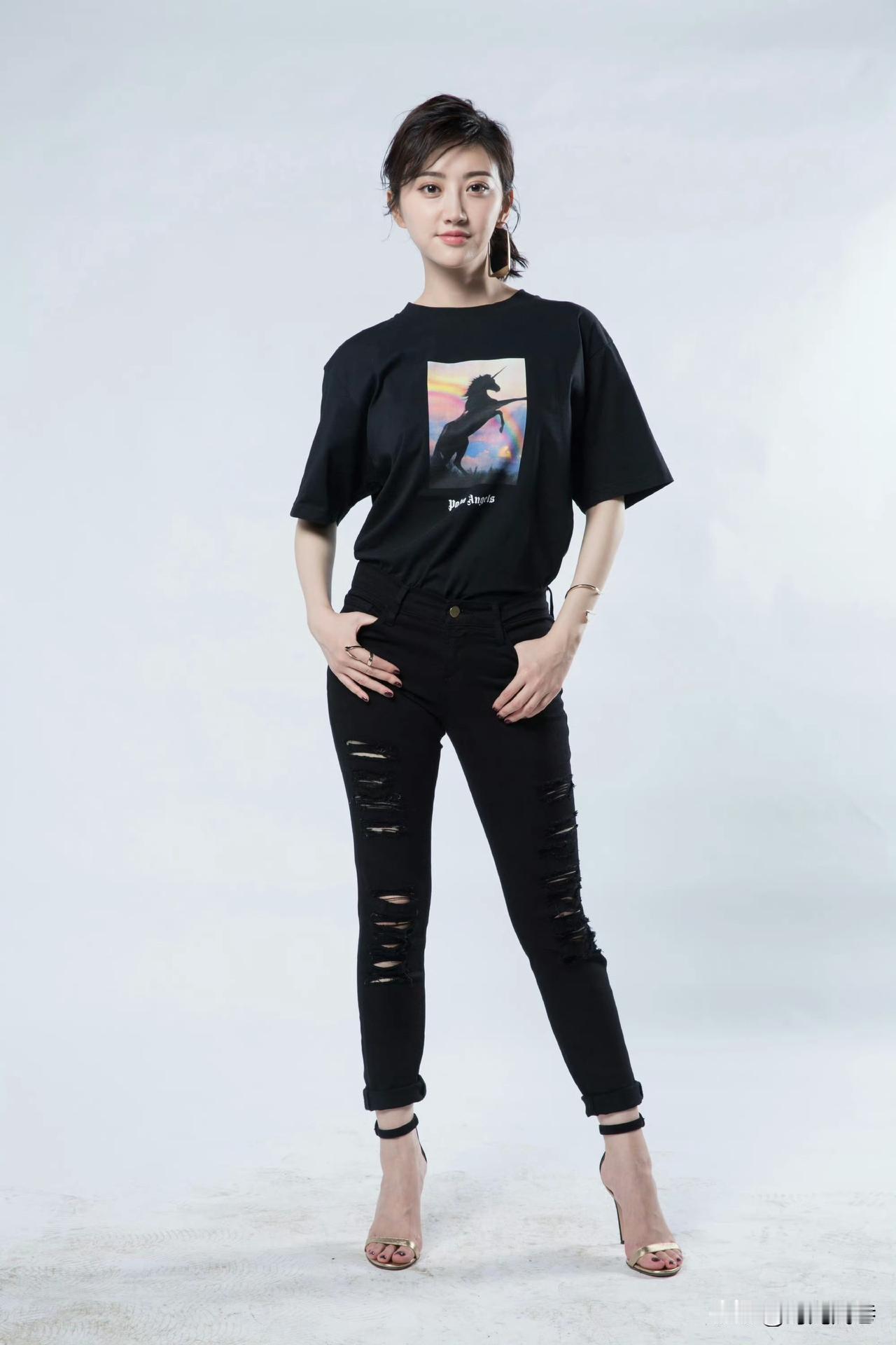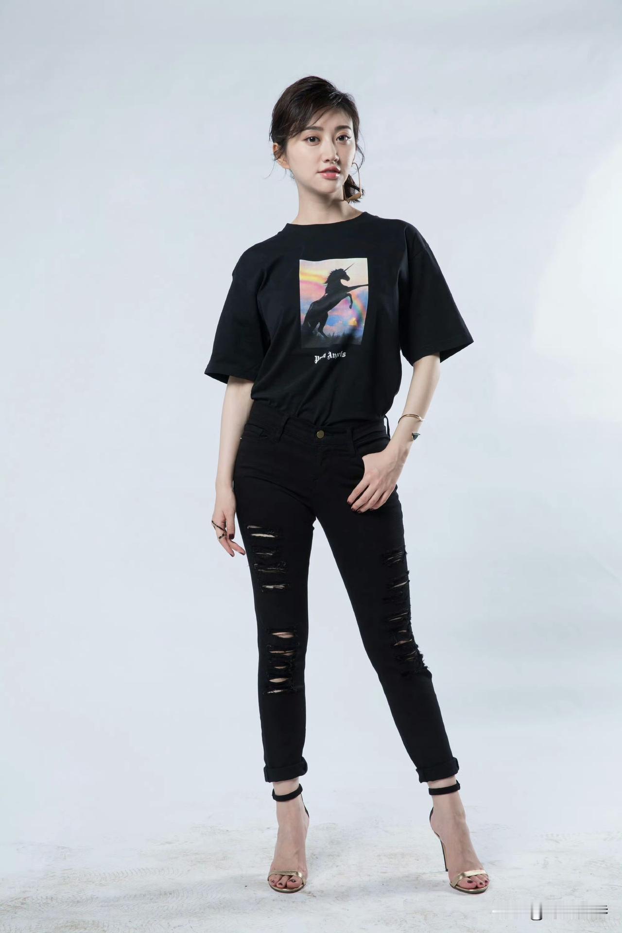 景甜黑色印花T恤搭配紧身黑色七分牛仔裤,脚穿一字带高跟凉鞋。青春和时尚的完美碰撞!又美又飒!