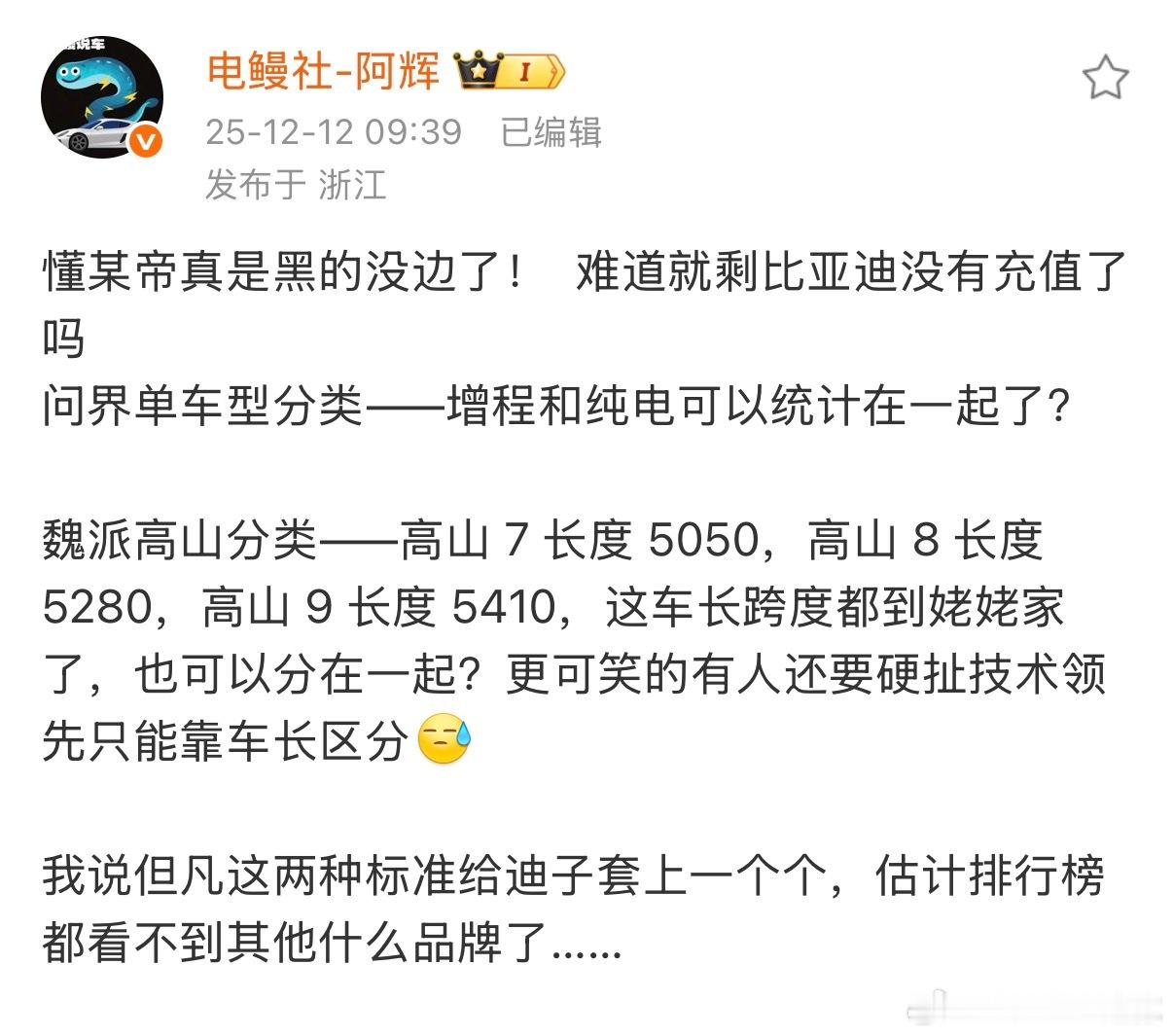 这种小儿科的东西我觉得没必要纠结,纠结到最后新能源销冠都是比亚迪,有什么意义呢总