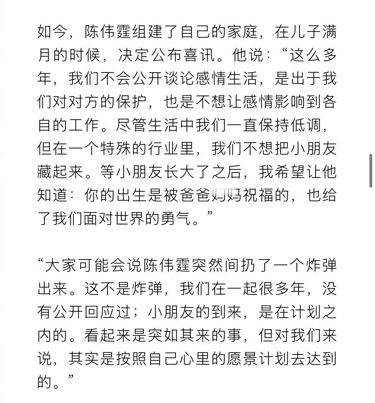 陈伟霆何穗不想把小朋友藏起来陈伟霆首谈官宣生子原因近日,陈伟霆在采访中首次详细谈及与妻子何穗的感情生活及官宣生子的原因。他解释,多年来选择不公开谈论感情,是出于相互的保护以及避免影响各自工作。关于孩子的到来,陈伟霆表示这是计划内的,并强调“我们不想把小朋友藏起来”。他们希望孩子知道:“你的出生是被爸爸妈妈祝福的,也给了我们面对世界的勇气。”采访中,谈及因热播剧角色被观众称为“好命哥”,陈伟霆大笑并自称“自己也非常好命”,但他也表示不会因此被定型,“我还是会拼,继续测试自己,尝试更多的东西。”