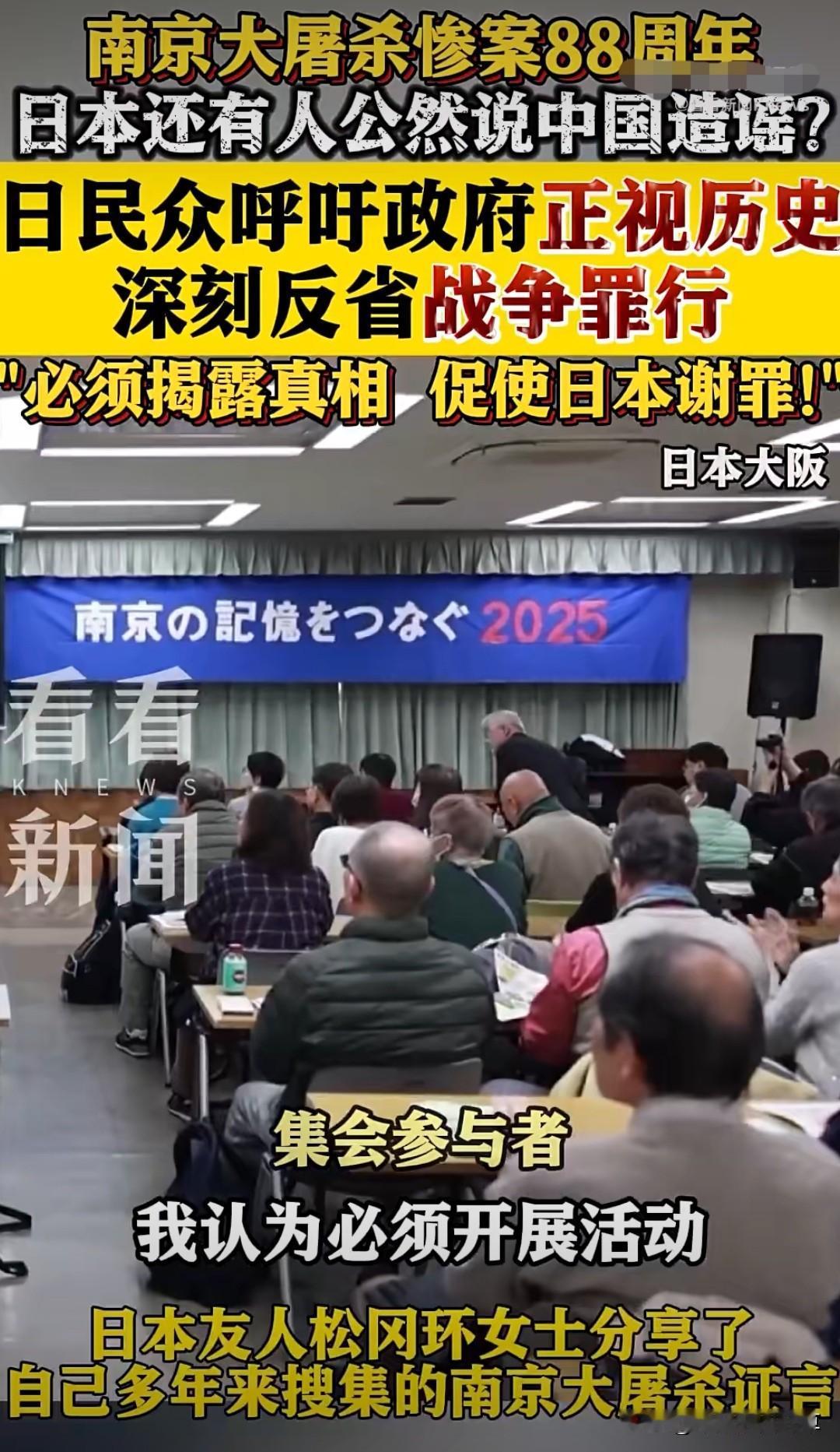 震惊!88年后竟还有日本人公然叫嚣南京大屠杀是“中国造谣”! 本以为这段30万同胞惨遭屠戮的血泪历史,早该被全世界牢牢铭记, 没想到谎言至今仍未消散,甚至有人试图抹去这段真相, 好在大阪的集会上,松冈环女士带着35年搜集的硬核证言站了出来——老兵的忏悔、幸存者的哭诉,字字戳心,150名日本民众也齐声呼吁:政府必须深刻反省,正视并承认历史, 有参会者说得恳切:正因为有人刻意歪曲,我们才更要把事实摆上台面,更要推动日本向中国正式谢罪, 你说,这样跨越国界的坚持,是不是在为历史留声,为和平铺就最坚实的道路? 信息来源:看看新闻 25年12月12日报道