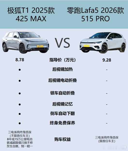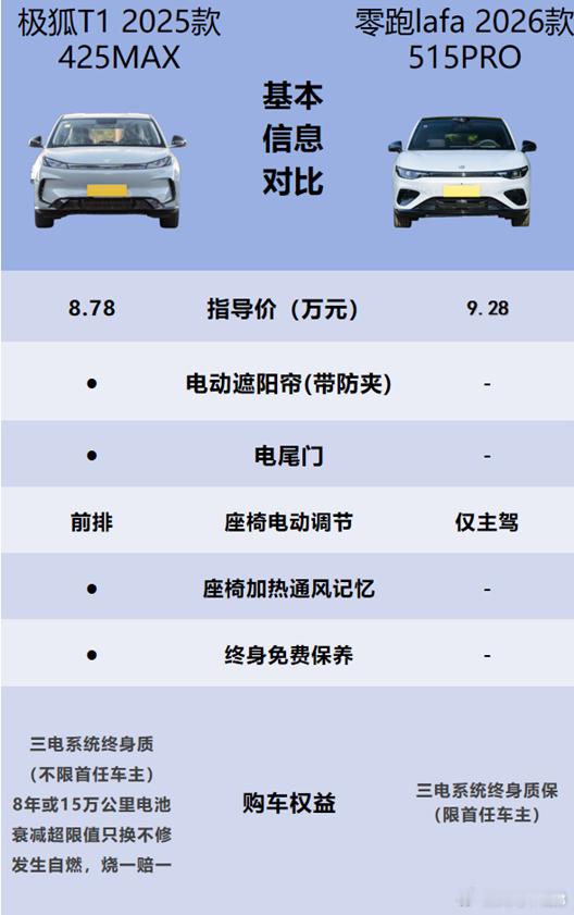 温馨座驾之争,零跑Lafa5对比极狐T1 谁更懂家庭所需一辆适合家庭的车,要能照顾到老人和孩子的每一个需求。极狐T12025款425MAX的前排座椅加热+通风功能,让老人乘坐时冬暖夏凉;零跑Lafa52026款515PRO的座椅仅主驾支持电动调节,没有加热与通风功能。针对老人搬运行李的需求,极狐T1配备了电动尾门,按一下就能操作;零跑Lafa5的尾门则需要手动开关。后排的电动遮阳帘则能为孩子遮挡刺眼阳光;零跑Lafa5的后排遮阳方式则是依赖车窗膜。极狐T1保养终身免费,三电质保还不挑车主;零跑Lafa5没这保养福利,三电质保也只跟首任车主。贴心的配置和靠谱的售后缺一不可,选对了车,就能把全家人的出行需求都照顾到,让每一次家庭出行都充满温馨。极狐T1零跑Lafa5买车买车一个理由就够了
