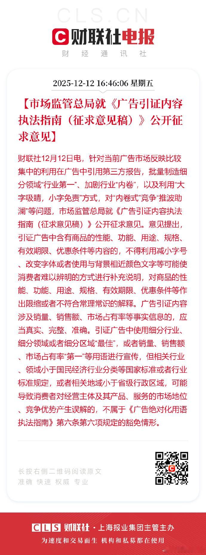 市场监管总局就《广告引证内容执法指南(征求意见稿)》公开征求意见关于新车市场价格和营销传播的相关政策越来越密集了不得利用减小字号等进行补充说明