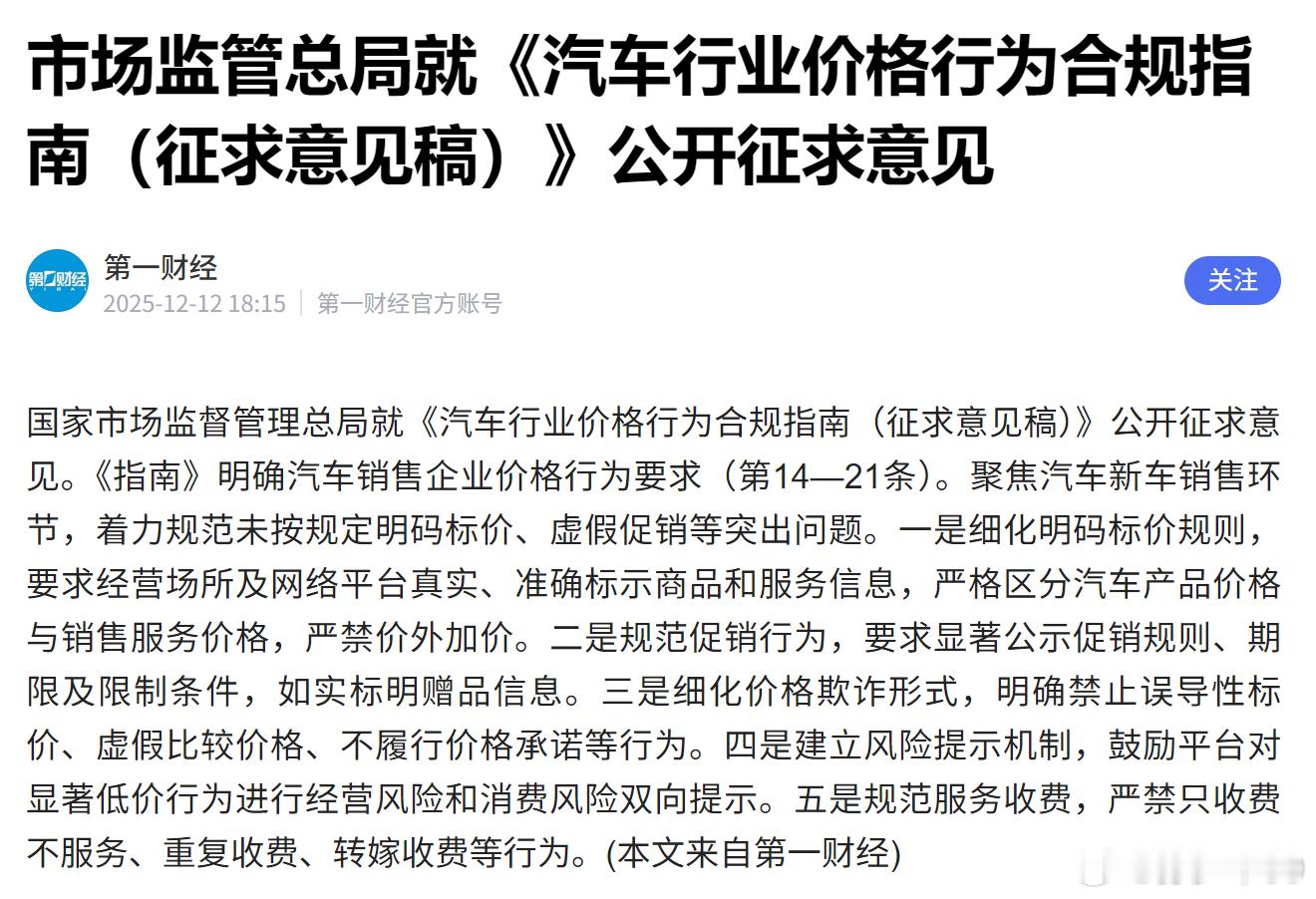 市场监管总局就《汽车行业价格行为合规指南(征求意见稿)》公开征求意见