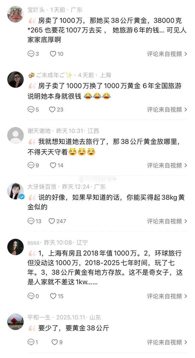 上海一奇女子2018年把家里房子卖了1000万、转身以265元每克买了38公斤的黄金、之后全球旅游了6年! 今年刚回到上海、看到之前卖掉的房子挂出了800万、于是以900元每克的价格卖掉了之前38公斤的黄金、又把房子给买了回来! 这波操作不仅房子回来了、口袋里还剩下了2600多万! 刚刚刷到的、真的假的啊?