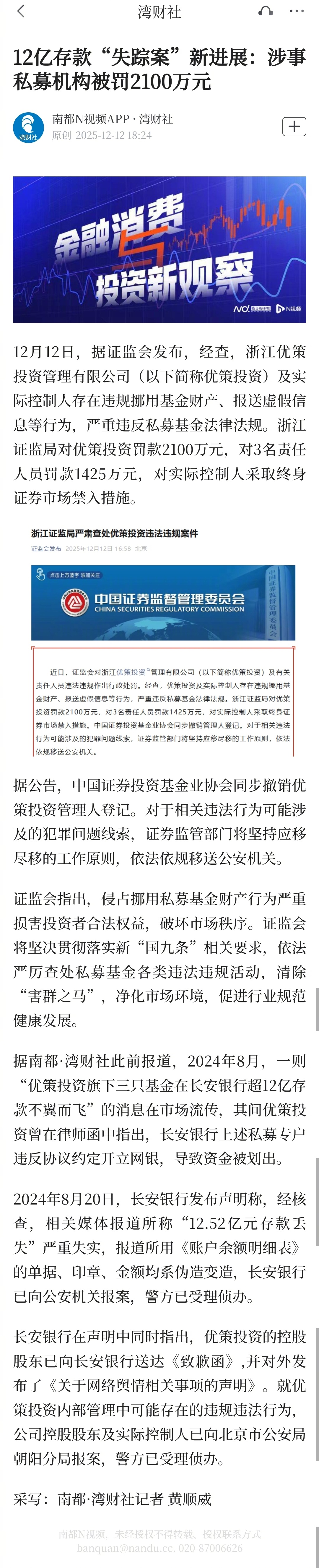 #12亿存款失踪案涉事私募被顶格重罚#【12亿存款“失踪案”新进展:涉事私募机构被罚2100万元】#私募机构优策投资被顶格重罚#12月12日,据证监会发布,经查,浙江优策投资管理有限公司(以下简称“优策投资”)及实际控制人存在违规挪用基金财产、报送虚假信息等行为,严重违反私募基金法律法规。浙江证监局对优策投资罚款2100万元,对3名责任人员罚款1425万元,对实际控制人采取终身证券市场禁入措施。据公告,中国证券投资基金业协会同步撤销优策投资管理人登记。对于相关违法行为可能涉及的犯罪问题线索,证券监管部门将坚持应移尽移的工作原则,依法依规移送公安机关。据介绍,相关处罚力度为顶格处罚,在私募监管领域“史上最重”。证监会指出,侵占挪用私募基金财产行为严重损害投资者合法权益,破坏市场秩序。证监会将坚决贯彻落实新“国九条”相关要求,依法严厉查处私募基金各类违法违规活动,清除“害群之马”,净化市场环境,促进行业规范健康发展。据南都·湾财社此前报道,2024年8月,一则“优策投资旗下三只基金在长安银行超12亿存款不翼而飞”的消息在市场流传,其间优策投资曾在律师函中指出,长安银行上述私募专户违反协议约定开立网银,导致资金被划出。2024年8月20日,长安银行发布声明称,经核查,相关媒体报道所称“12.52亿元存款丢失”严重失实,报道所用《账户余额明细表》的单据、印章、金额均系伪造变造,长安银行已向公安机关报案,警方已受理侦办。长安银行在声明中同时指出,优策投资的控股股东已向长安银行送达《致歉函》,并对外发布了《关于网络舆情相关事项的声明》。就优策投资内部管理中可能存在的违规违法行为,公司控股股东及实际控制人已向北京市公安局朝阳分局报案,警方已受理侦办。采写:南都·湾财社记者 黄顺威