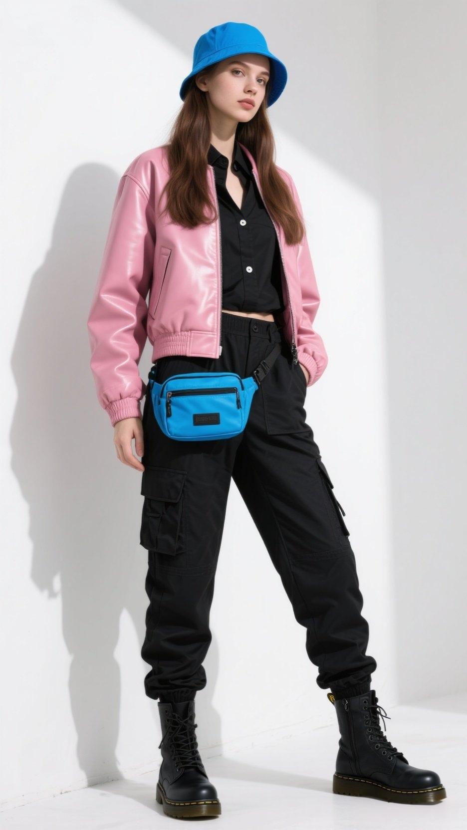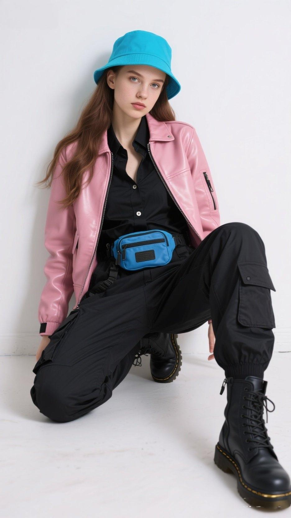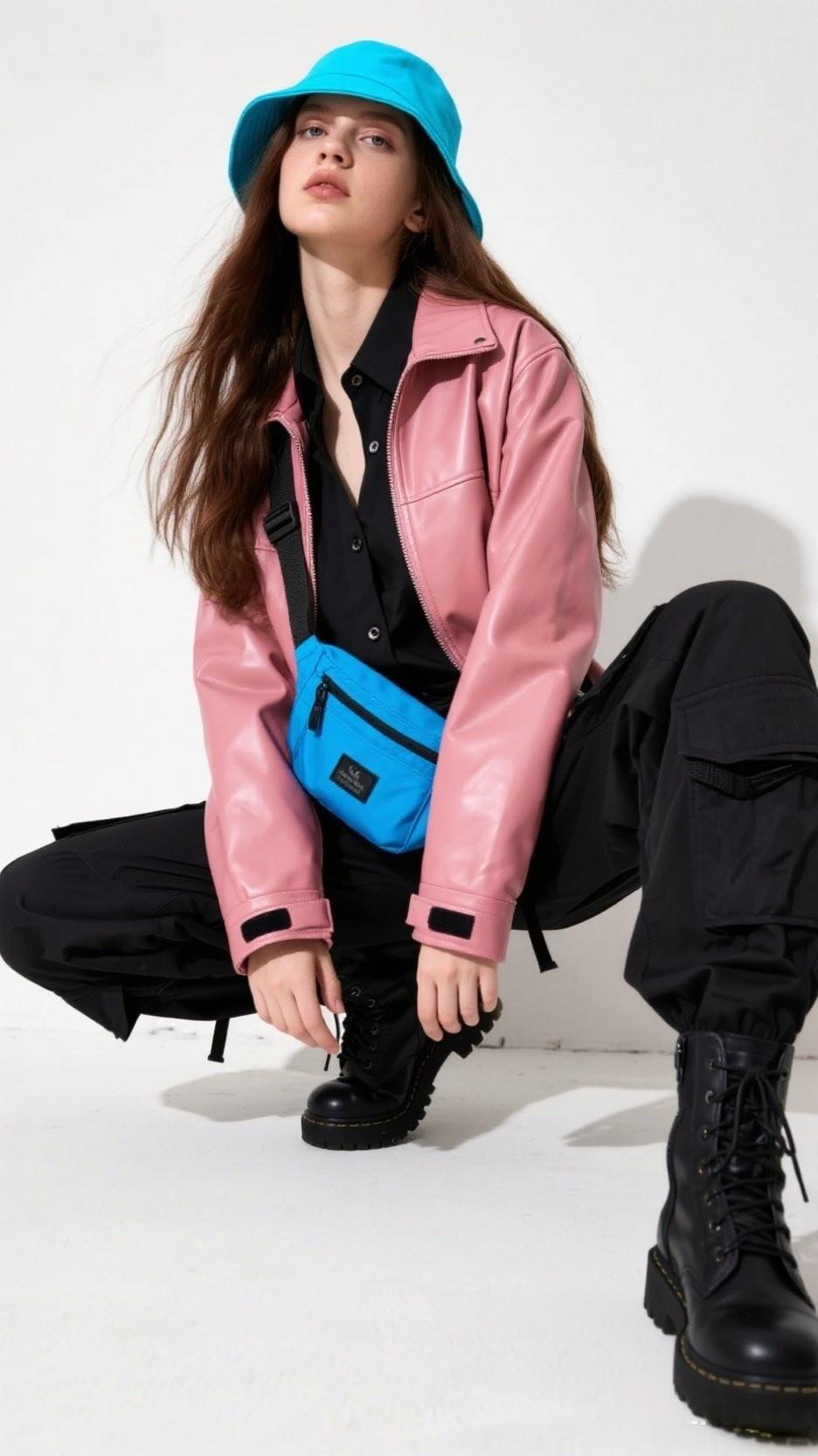 潮流穿搭确实魅力十足!粉色皮夹克配黑色工装裤,再搭蓝色渔夫帽和腰包,这组合太妙了。粉色皮夹克打破常规,告别沉闷,给整体造型注入活泼感;黑色工装裤自带酷帅属性,多口袋设计增添层次感;蓝色渔夫帽点缀其中,提亮色彩,还能防晒凹造型;腰包实用又时尚,随手放些小物件超方便。这让我想起冬日的复古穿搭,像黑色皮夹克搭工装裤和大黄靴,美式复古感也很绝。不同季节的复古穿搭各有千秋,都能让你成为街头焦点。 皮夹克穿搭女 皮夹克穿搭