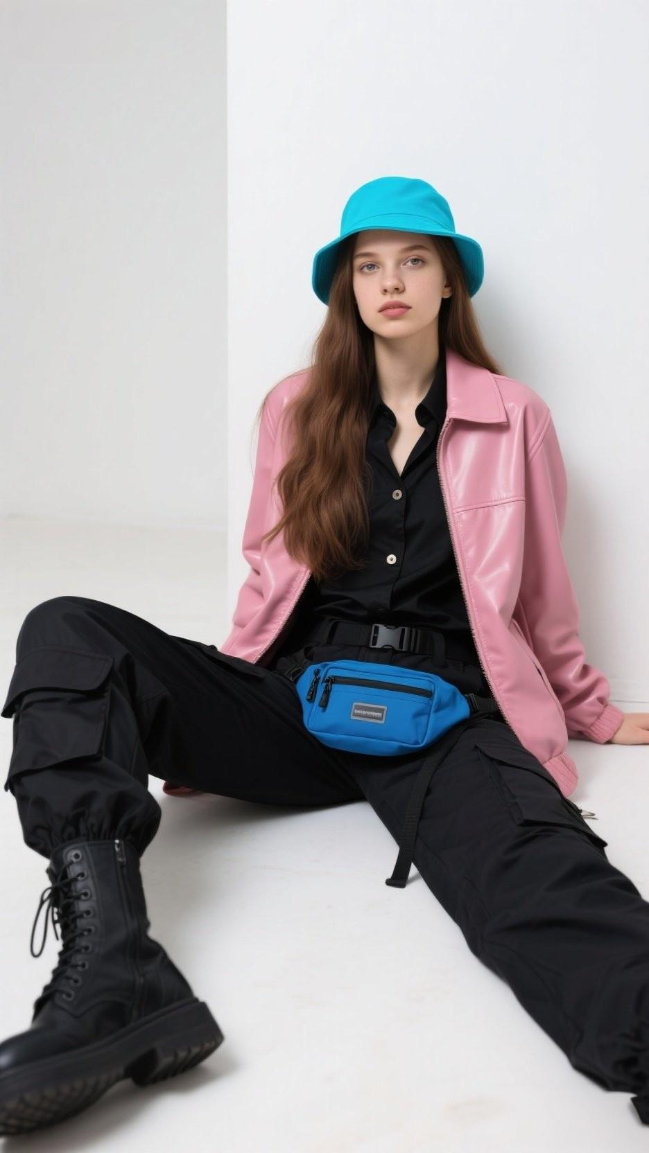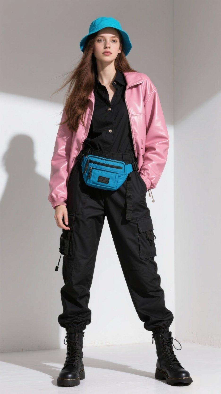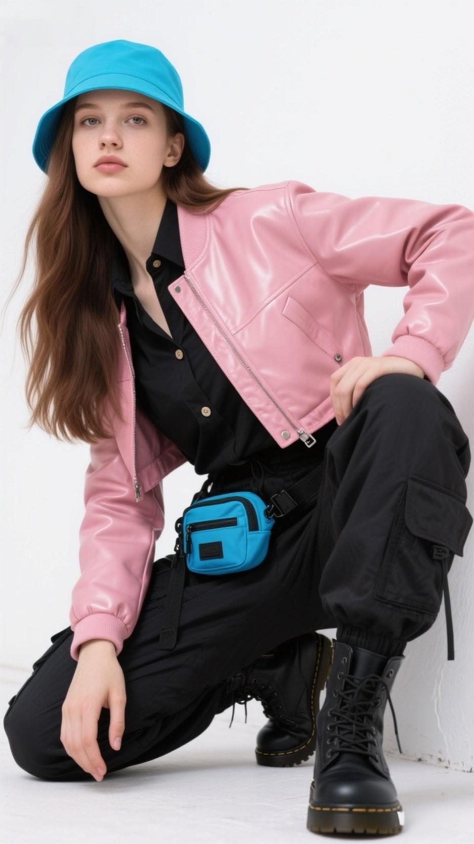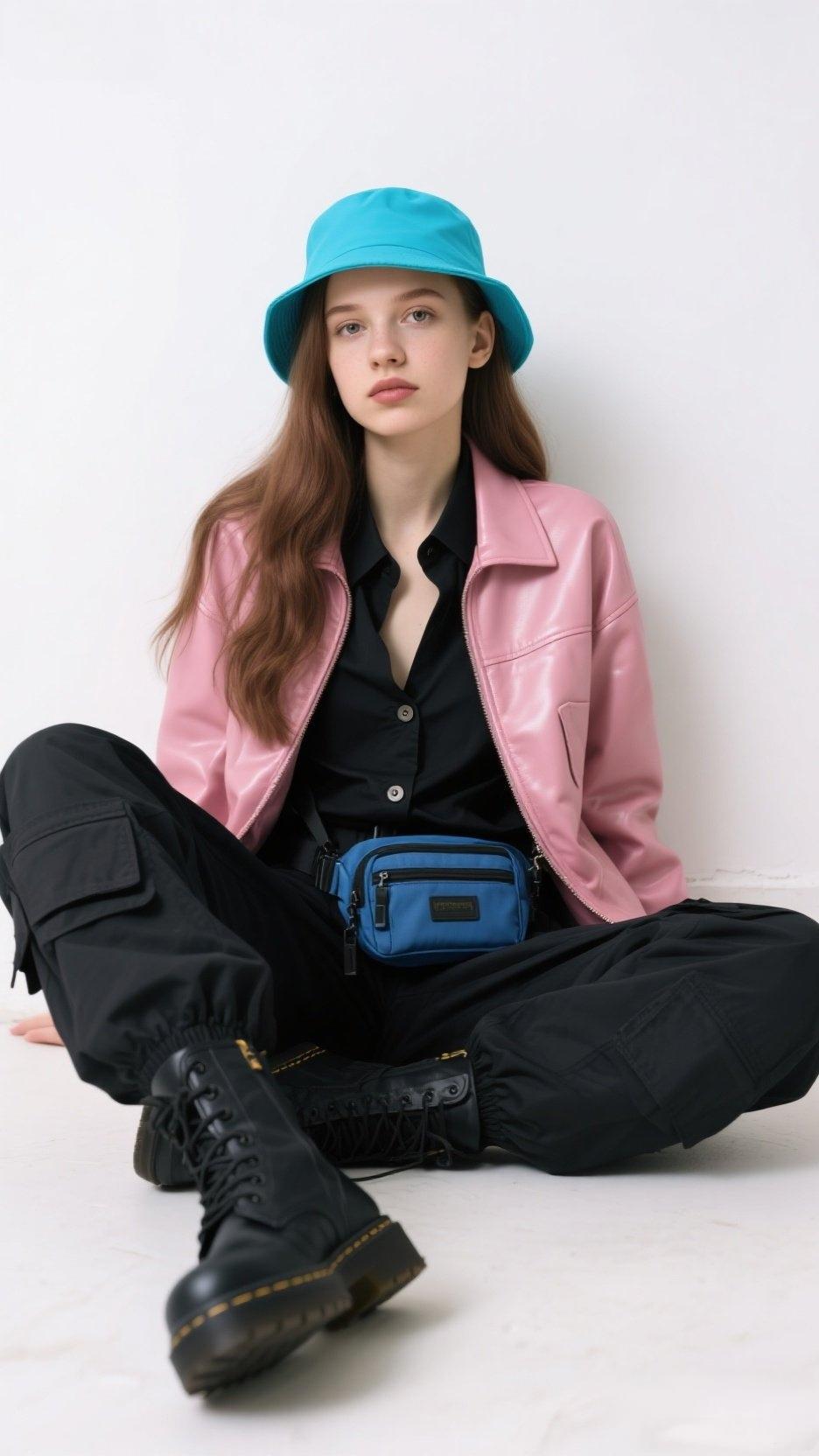 潮流穿搭确实魅力十足!粉色皮夹克配黑色工装裤,再搭蓝色渔夫帽和腰包,这组合太妙了。粉色皮夹克打破常规,告别沉闷,给整体造型注入活泼感;黑色工装裤自带酷帅属性,多口袋设计增添层次感;蓝色渔夫帽点缀其中,提亮色彩,还能防晒凹造型;腰包实用又时尚,随手放些小物件超方便。这让我想起冬日的复古穿搭,像黑色皮夹克搭工装裤和大黄靴,美式复古感也很绝。不同季节的复古穿搭各有千秋,都能让你成为街头焦点。 皮夹克穿搭女 皮夹克穿搭