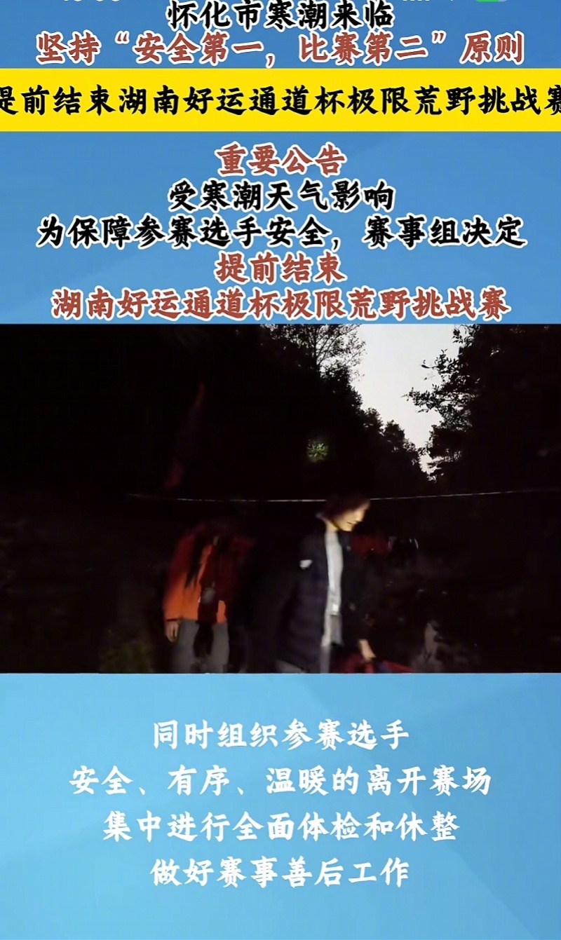 #又一荒野挑战赛因寒潮停赛#【湖南又一荒野挑战赛因寒潮提前结束!9名选手平分25万奖金】#荒野挑战赛停赛9选手平分25万奖金#自张家界七星山“荒野求生”挑战赛提前结束比赛后,怀化“好运通道杯”极限荒野挑战赛也宣布因寒潮中止比赛。12月12日,怀化荒野挑战赛举办方告诉南都N视频记者,未退赛的9名选手将平分25万元奖金。公告称,将同时组织参赛选手离开赛场,集中进行全面体检和休整,做好赛事善后工作。12月12日,怀化“好运通道杯”极限荒野挑战赛负责人向南都记者表示,赛事于10月8日开赛,108名选手历经62天生存挑战后,剩下10名选手进入决赛。决赛第7天,场上还有9名选手,其中包含2位女选手。“我们会对所有选手进行全面体检、赛后恢复及心理疏导。9名选手将平分25万元奖金。”南都此前报道,近期,南都记者走访调查发现,荒野求生赛爆火,以张家界七星山“荒野求生”挑战赛为例,在20万冠军奖金的激励下,4万人报名参赛,最终13人闯进决赛。但多地涌现的荒野求生赛如何长远发展下去,仍有待检验。早前,云南西畴县香坪山景区“木兰杯”荒野求生技能大赛,因气温骤降被紧急叫停。田健兵也坦言,“荒野求生的市场很大,要做的事还有很多。”采写:见习记者 付冰洁 南都N视频记者 韦娟明