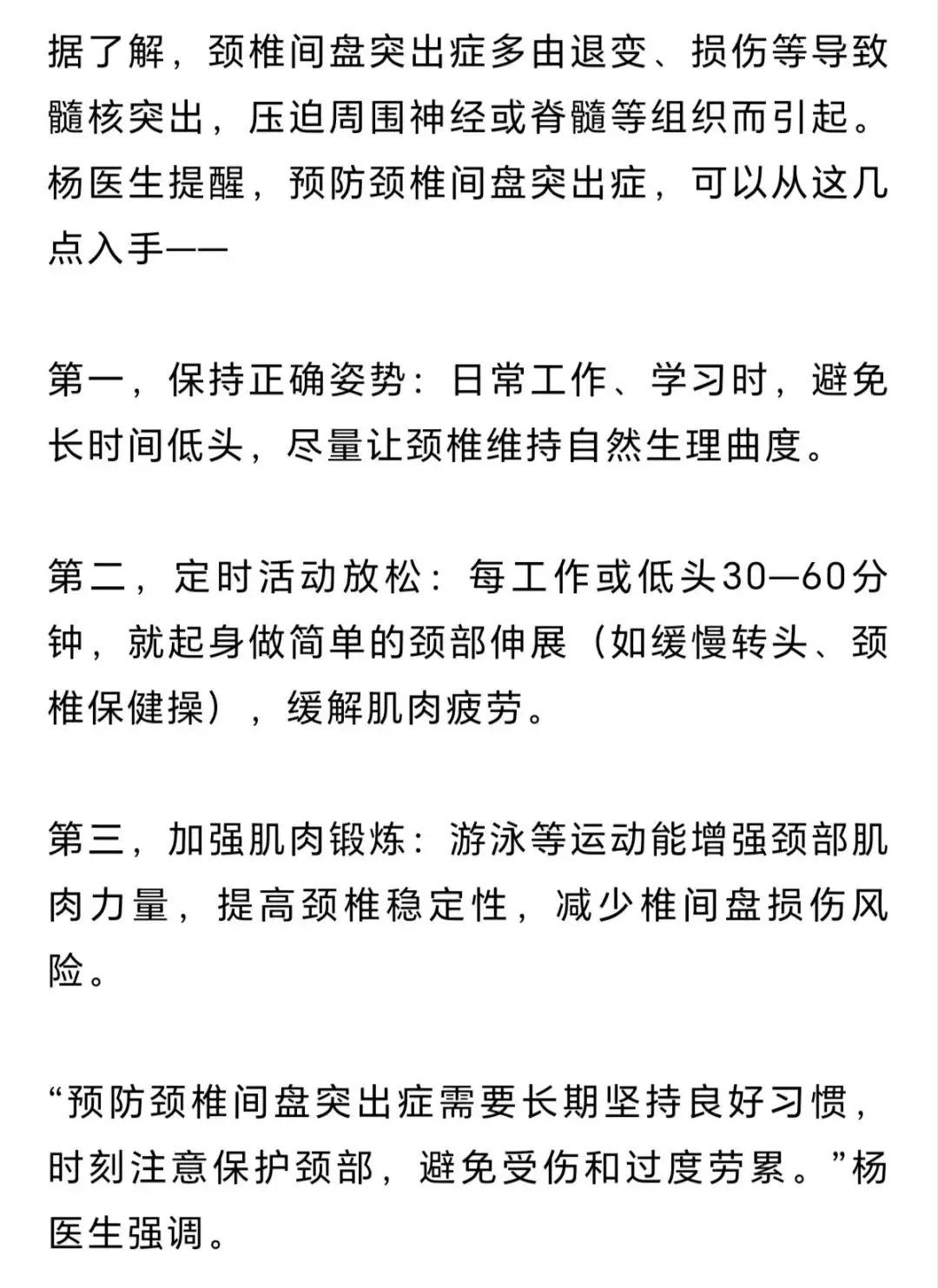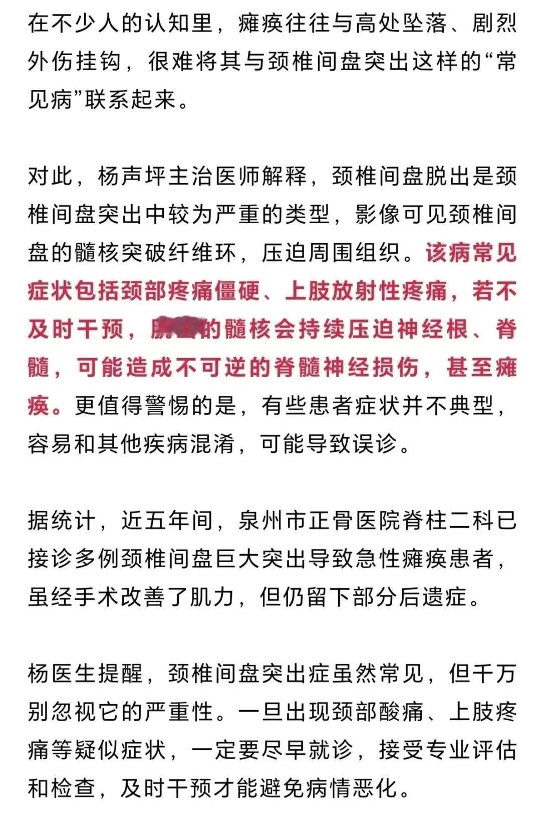 女子拒绝颈椎病手术当晚瘫痪:比疾病更可怕的,是对专业的傲慢 “脖子疼算什么大事?贴贴膏药、按摩一下就好了。”38岁的李女士怎么也没想到,这句自己深信不疑的话,竟让她一夜之间从职场精英变成了卧床病人。当医生拿着检查报告反复强调“脊髓已严重受压,必须立刻手术”时,她被“手术风险高”的传言吓退,固执地选择了出院,却没料到命运的惩罚来得如此之快。 那天晚上,李女士像往常一样坐在沙发上刷手机,突然一阵剧烈的颈痛袭来,紧接着双腿瞬间失去知觉,身体不受控制地滑落在地,连呼救的声音都变得含糊不清。丈夫慌乱中拨通120,再次送到医院时,医生的话让全家陷入绝望:“脱出的椎间盘突发卡压脊髓,再晚1小时,神经功能就可能永久损伤,这辈子都站不起来了。” 紧急手术后,李女士在重症监护室躺了整整一周。当她醒来看着自己毫无知觉的下半身,眼泪止不住地流:“我以为保守治疗能慢慢好,怕手术影响工作,更怕万一失败……现在工作没了,还成了家里的累赘。”经过三个月康复,她虽能在搀扶下缓慢行走,却可能永远留下后遗症,那些曾经不以为然的颈肩酸痛,终究酿成了无法挽回的遗憾。 无独有偶,福建泉州的王女士也因同样的侥幸心理,在拒绝颈椎手术后,翻身拿手机的瞬间突发双上肢瘫痪。这些案例并非个例,世界卫生组织数据显示,全球约30%的患者会忽视医生的紧急建议,而脊髓型颈椎病患者中,拖延治疗的瘫痪风险高达40%。我们总爱用“没时间”“怕麻烦”“不相信”敷衍身体的预警,却忘了颈椎是人体的“顶梁柱”,脊髓受压就像电线短路,一次不经意的扭头、翻身都可能成为压垮骆驼的最后一根稻草。 如今,越来越多年轻人加入“低头族”,颈肩不适早已不是中老年人的专利。但比颈椎退变更可怕的,是对专业医疗的偏见与傲慢,是把“侥幸”当“底气”的自我消耗。身体从不会说谎,那些被我们轻视的小疼痛,可能正是生命发出的求救信号。 健康从来没有后悔药,医生的专业建议不是恐吓,而是守护。别让一时的固执毁掉一辈子的幸福。你身边有没有人忽视过身体预警?欢迎在评论区分享你的看法,提醒更多人珍惜健康、相信科学!