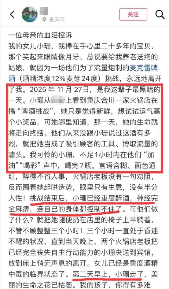 湖北一姑娘,参加啤酒挑战赛,喝了七瓶啤酒去世。大家警醒吧!说是麦克雷。度数很高。喝了七瓶,痴睡三小时无人管。最后架着人姑娘,拿着兜里的身份证开的房间,放在床上,后直接走人。早上就发现人没了。 人的生命太脆弱了。做对自己有益的事吧!太难。真很无语。