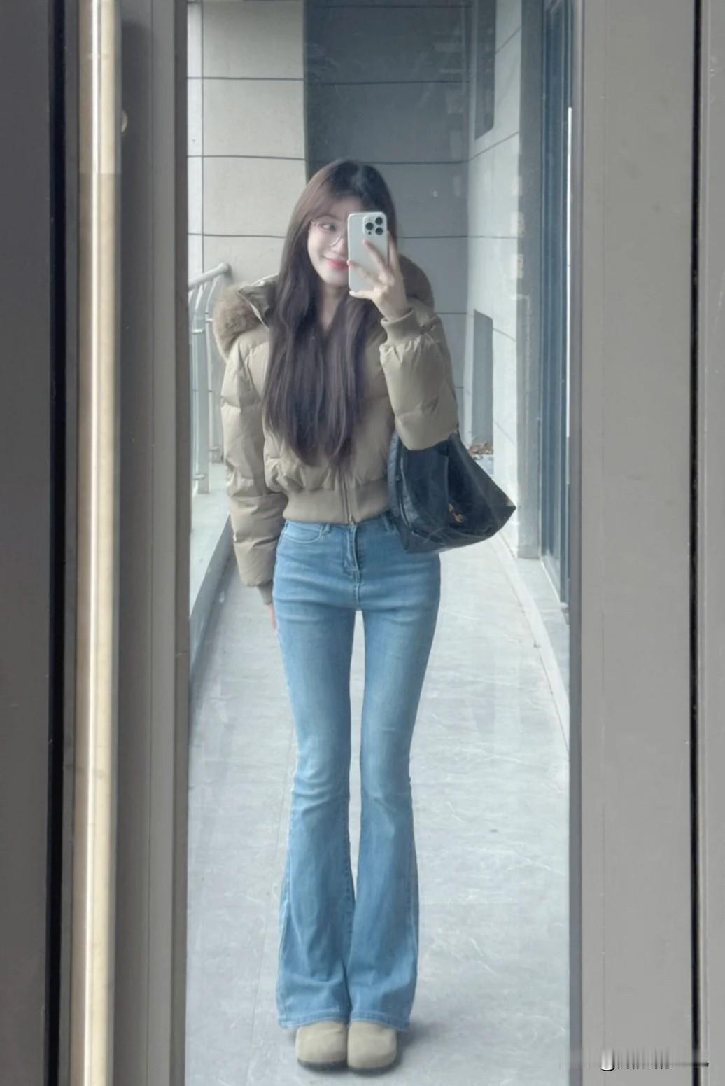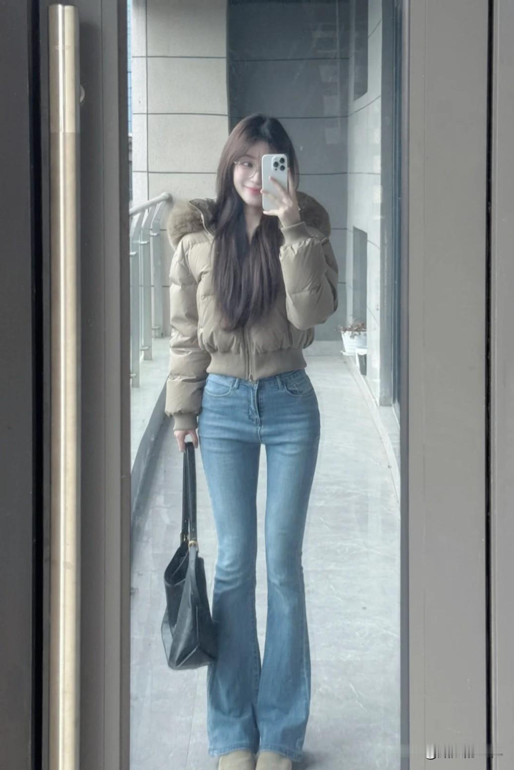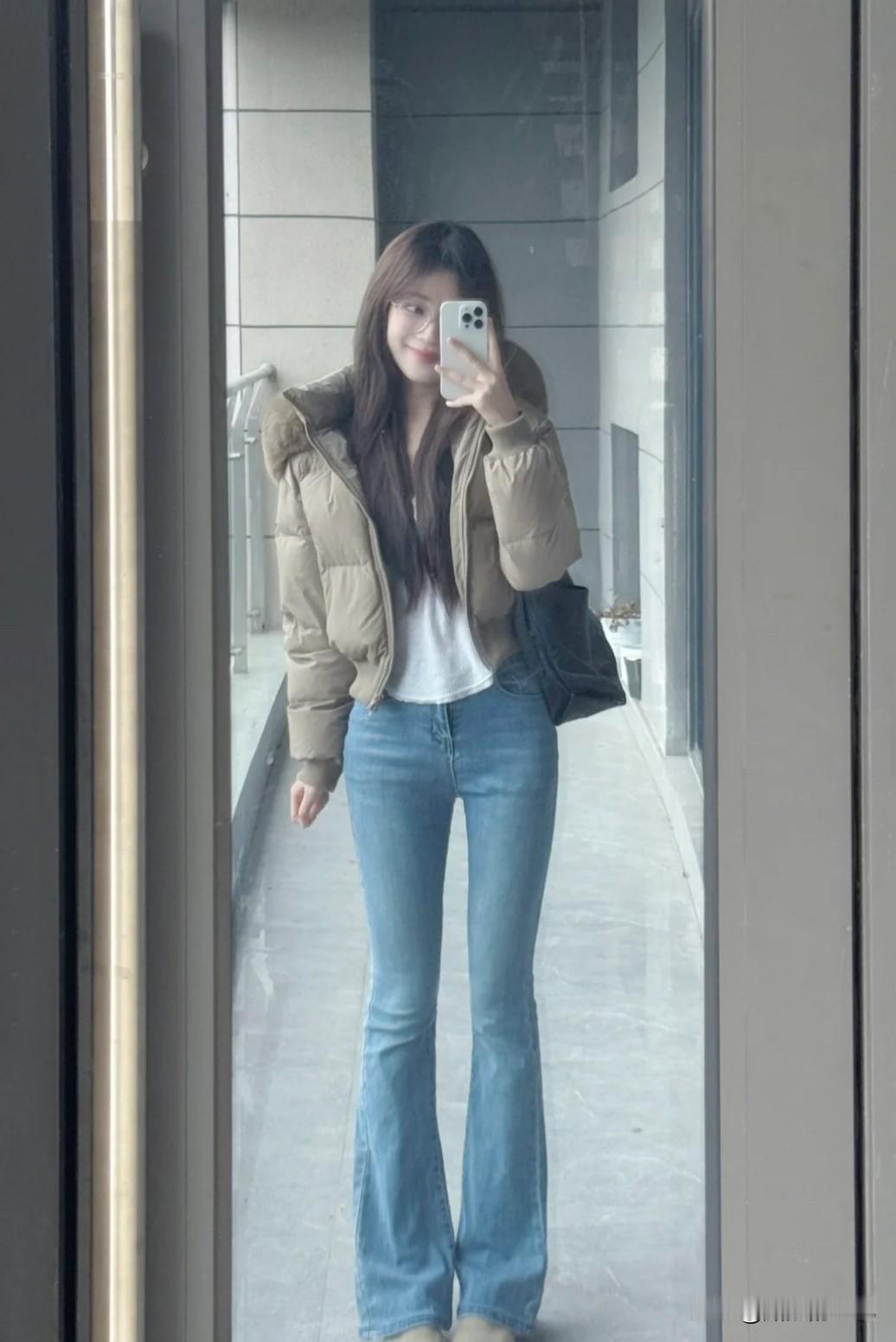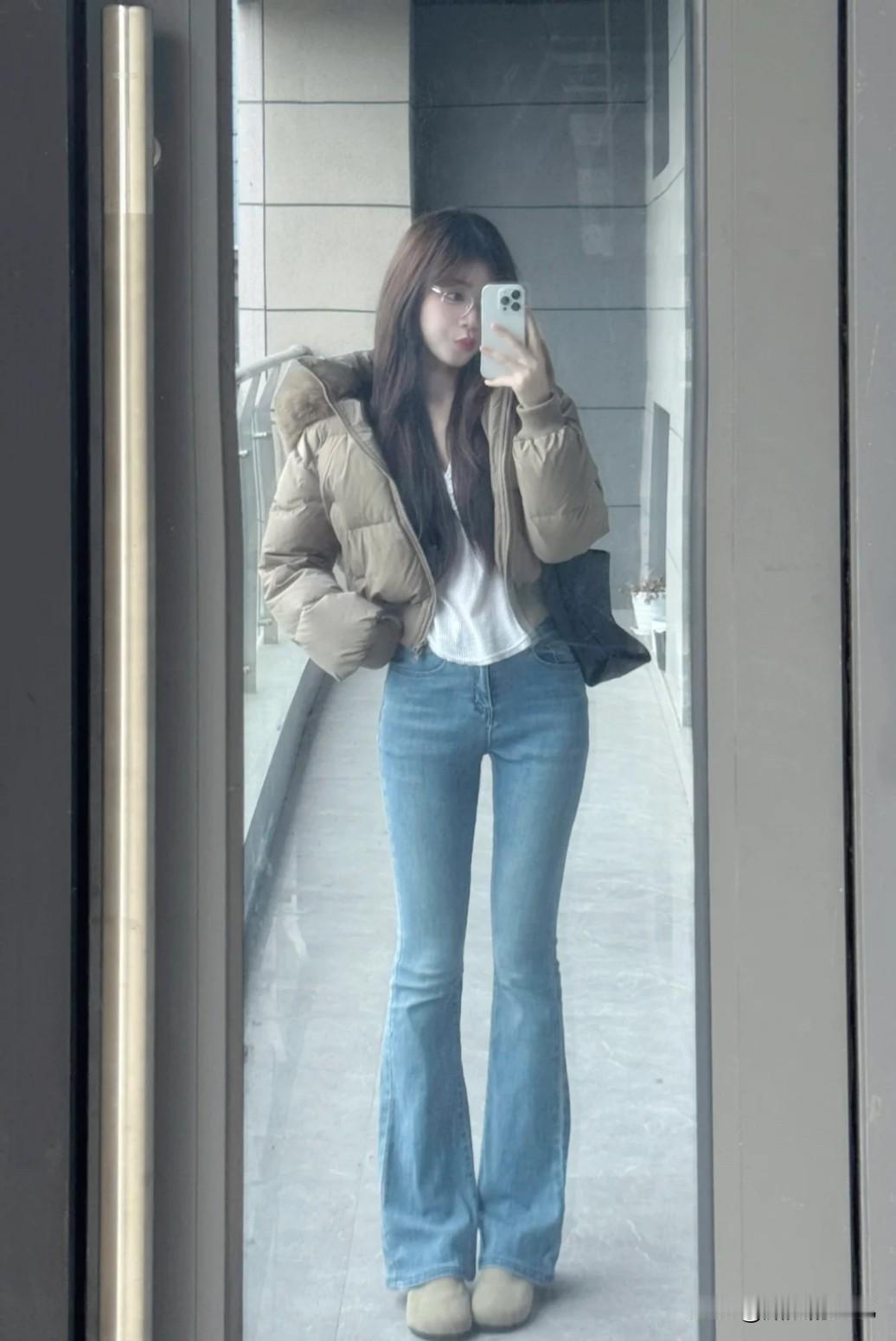 米白短羽绒×微喇牛仔:腿长瞬间+10cm,小个子秒变“高挑”开挂![比心][比心][比心] 中高腰牛仔穿搭 牛仔短款穿搭