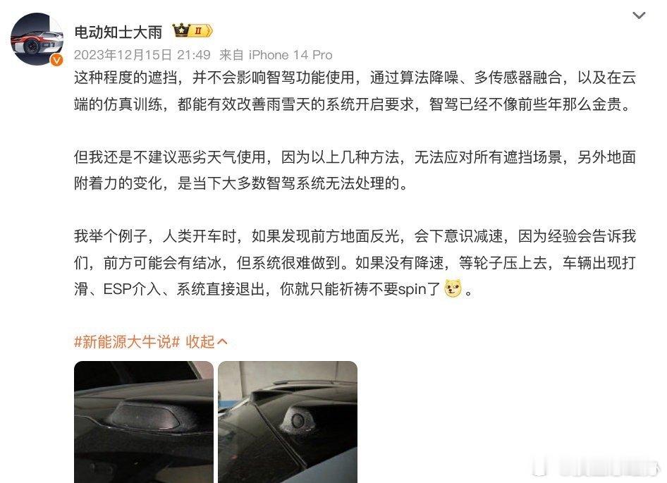 雪天能不能用智能辅助驾驶 北京的大雪马上就要来了!小黑之前投票问大家最担心什么,很多人都怕打滑、甩尾、刹不住车,也有网友问,我用智能辅助驾驶会不会好点儿呢?小黑觉得最好别用,虽然有些车型的辅助驾驶具备全路况感知能力,能探测到冰雪路面的摩擦力从而调整动力、刹车、并线策略,但是,下雪天环境感知硬件,比如毫米波雷达、激光雷达等,很可能被冰雪覆盖和遮挡(图5),车辆失去了“眼睛”,岂不是很危险。车辆也会提示让你清理雷达,最终还是得接管。