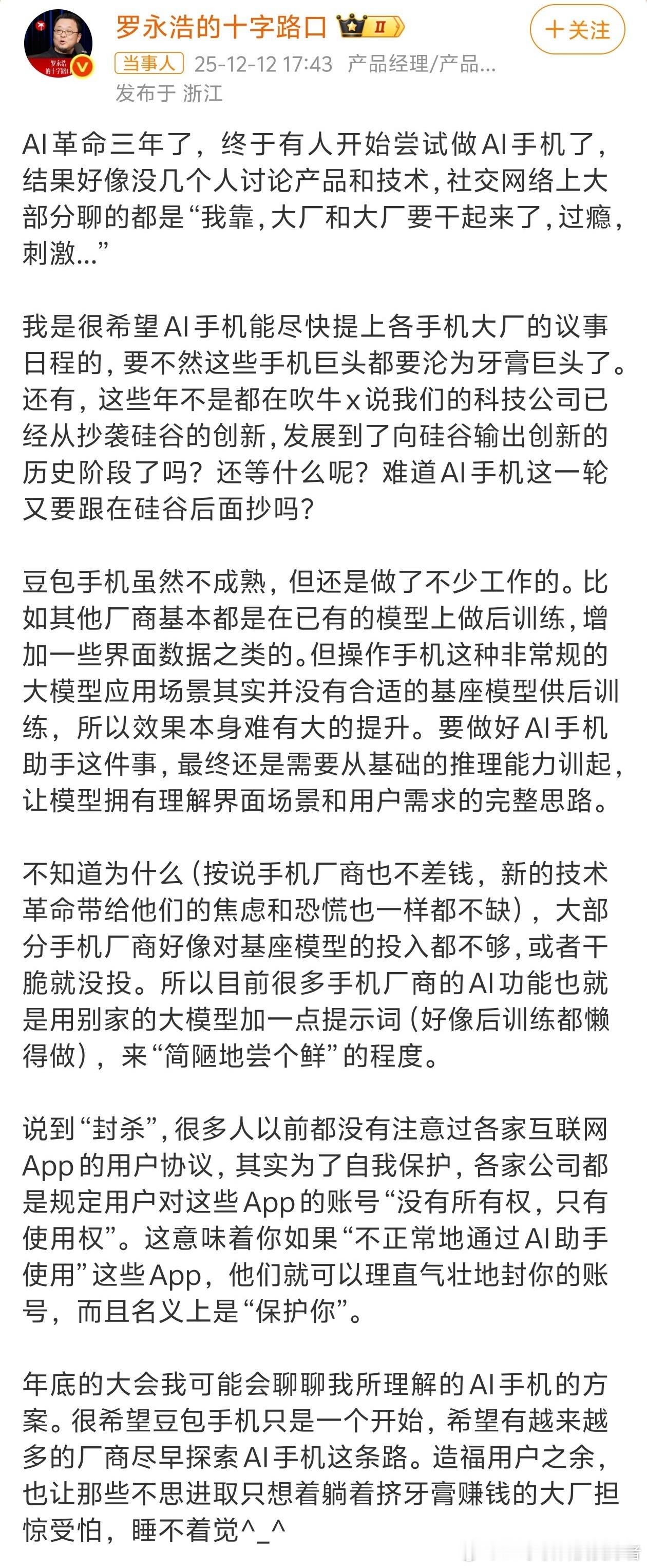 罗永浩批手机大厂沦为牙膏厂实话实说,现在的手机行业创新不足是真的,但中国厂商也在努力探索新的方向。AI是大趋势,所有手机厂商都在做,谁也不能落后。只不过,现在硬件部分没啥亮点是真的,如果罗永浩还在手机行业,我觉得他的确能捣鼓出一些新东西。