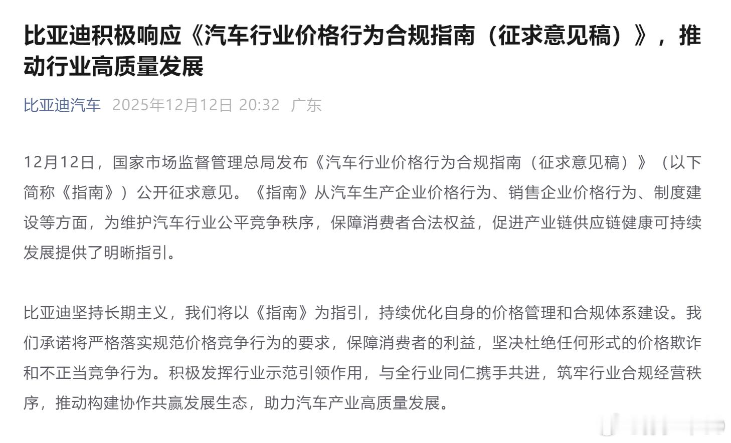 比亚迪和小鹏发声,积极响应《汽车行业价格行为合规指南(征求意见稿)》今晚各家应该都会发
