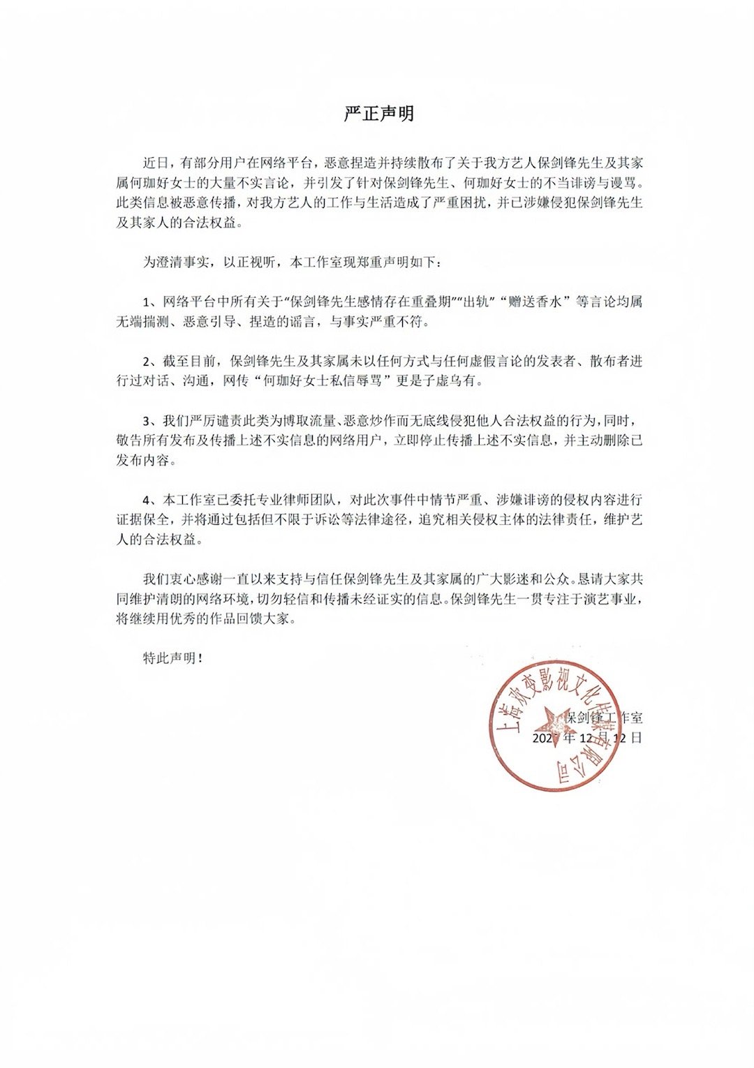 保剑锋工作室回应保剑锋工作室严正声明 发布严正声明,称所有关于“感情重叠期”“出轨”“赠送香水”等言论均为捏造,与事实不符。保剑锋及其家属从未与谣言发布者沟通,网传“何加好私信辱骂”也是虚假信息。呼吁大家切勿造谣传谣,并保留一切法律追究权利。